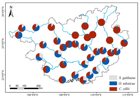 The numerical ratios of the three tilapia species are shown in Figure 5, showing distinct distribution characteristics in spatial distribution: C. zillii was dominant in the northern study area, and there was no distribution of S. galilaeus, and the proportion of O. niloticus was extremely low. S. galilaeus started to appear in the central region, and the percentage of O. niloticus also increased. The proportion of S. galilaeus and O. niloticus increased as latitude moved south.