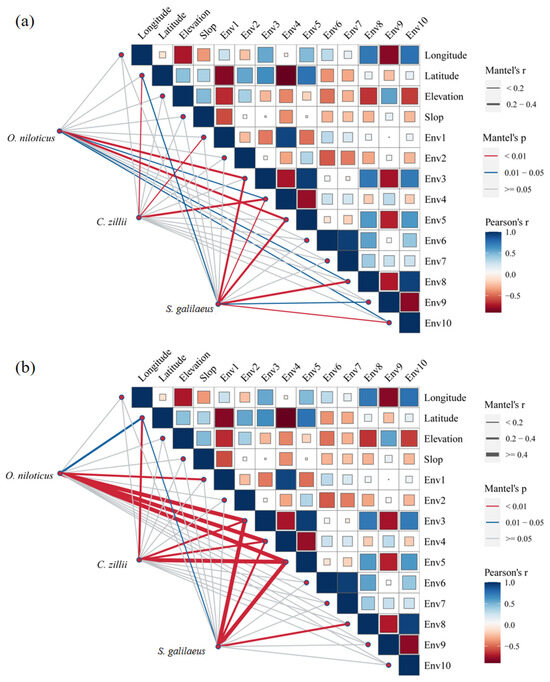 Mantel test analysis of abundance of the three tilapia species and geographical factors and environmental factors (a) and Mantel test analysis of numerical ratios of the three tilapia species and geographical factors and environmental factors (b). ENV1, annual mean temperature; ENV2, mean diurnal range; ENV3, temperature seasonality; ENV4, min temperature of coldest month; ENV5, temperature annual range; ENV6, annual precipitation; ENV7, precipitation of wettest month; ENV8, precipitation of driest month; ENV9, precipitation seasonality; ENV10, precipitation of coldest quarter.