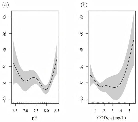 Response of O. niloticus number to (a) pH, and (b) CODMN based on the GAM model.
