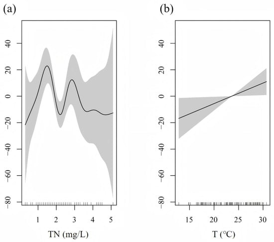 Response of C. zillii number to (a) TN, and (b) T based on the GAM model.