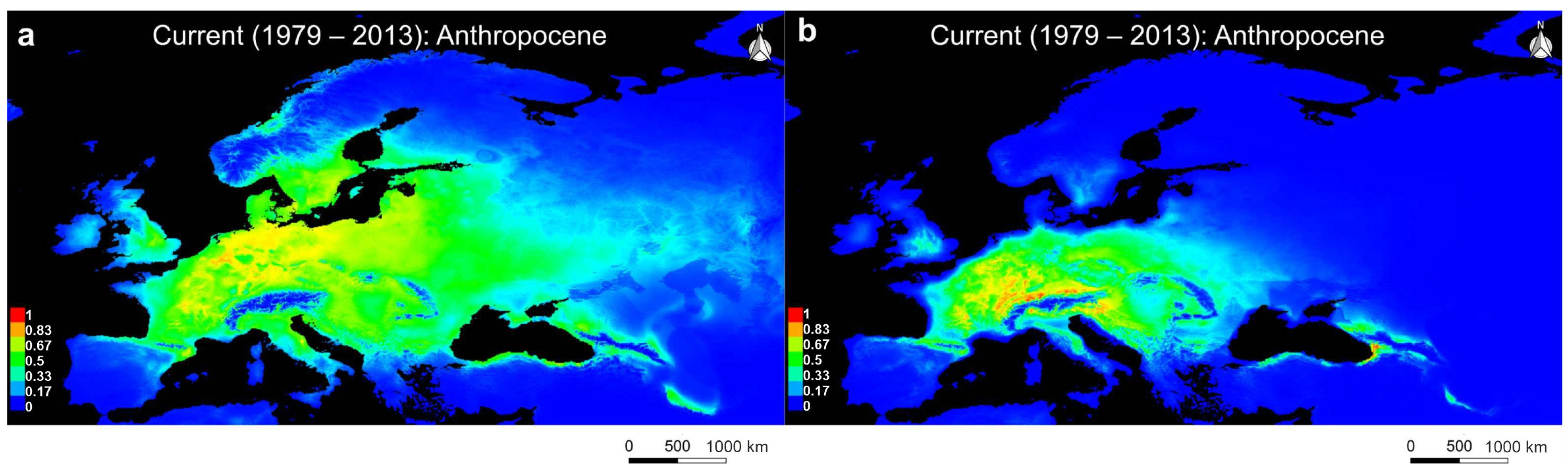 Figure 3. SDM for (a) U. crassus and (b) U. nanus for the Current (1979–2013): Anthropocene; Warmer colors indicate higher suitability, while blue indicates unsuitable areas.