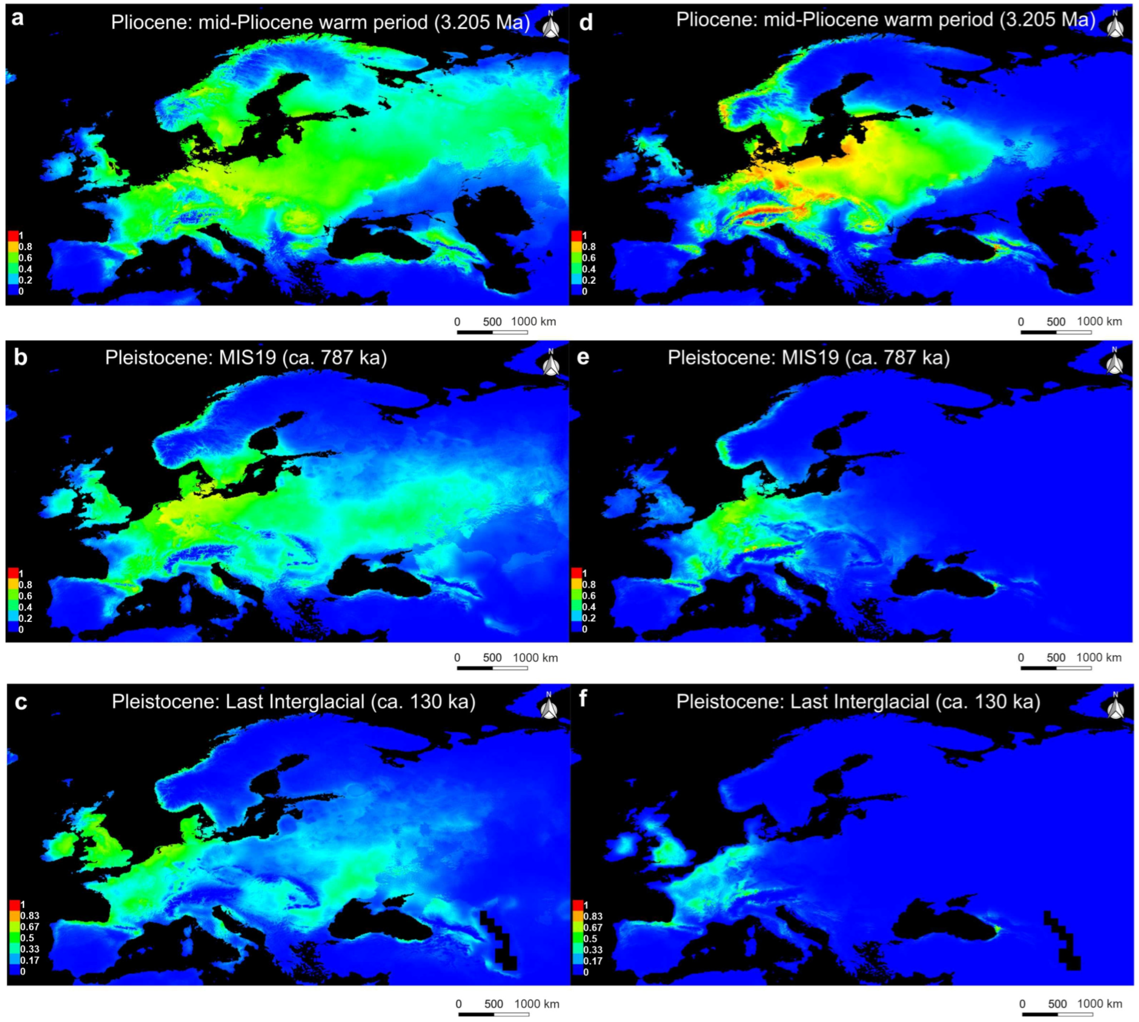 Figure 4. PaleoSDM for U. crassus (ac) and U. nanus (df) over time: (a) U. crassus during mid-Pliocene Warm period (3.205 Ma); (b) U. crassus during Marine Isotope Stage 19 (787 ka); (c) U. crassus during Last Interglacial Period (130 ka); (d) U. nanus during mid-Pliocene Warm period (3.205 Ma); (e) U. nanus during Marine Isotope Stage 19 (787 ka); (f) U. nanus during Last Interglacial Period (130 ka); warmer colors indicate higher suitability, while blue indicates unsuitable areas.