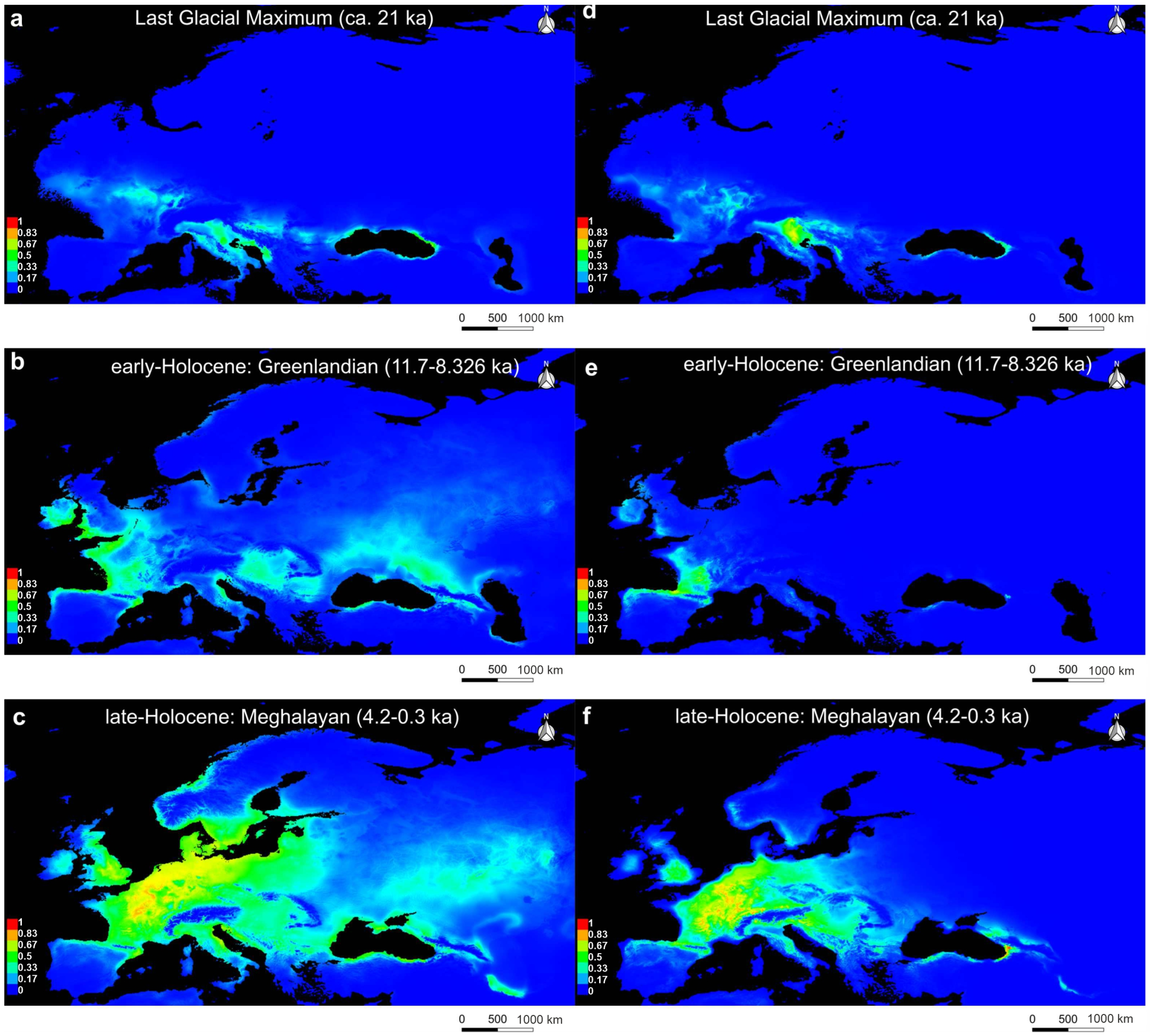 Figure 5. PaleoSDM for U. crassus (ac) and U. nanus (df) over time: (a) U. crassus during Last Glacial Maximum (21 ka); (b) U. crassus during early-Holocene, Greenlandian (11.7–8.326 ka); (c) U. crassus during late-Holocene, Meghalayan (4.20.3 ka); (d) U. nanus during Last Glacial Maximum (21 ka); (e) U. nanus during early-Holocene, Greenlandian (11.7–8.326 ka); (f) U. nanus during late-Holocene, Meghalayan (4.20.3 ka); Warmer colors indicate higher suitability, while blue indicates unsuitable areas.