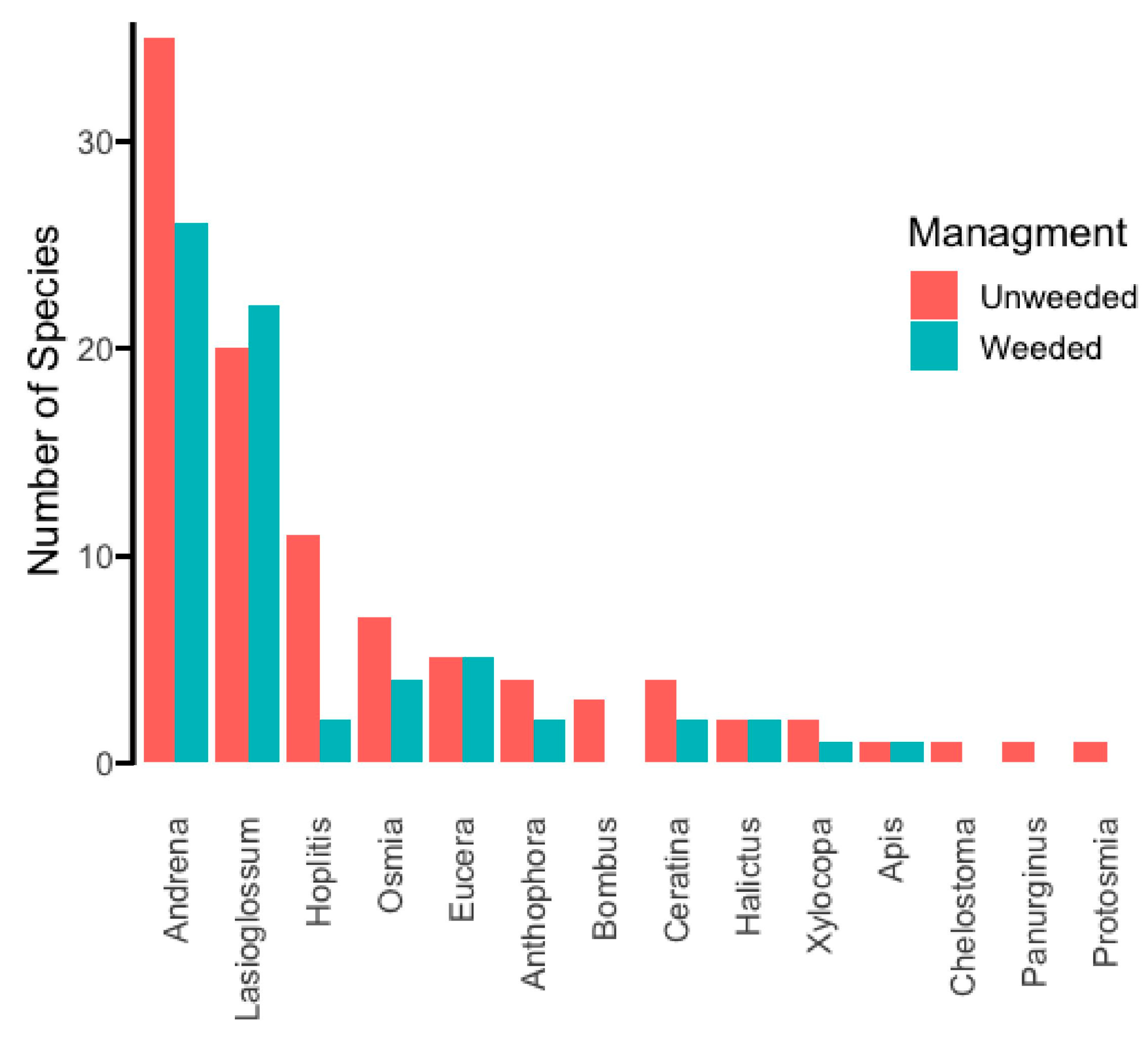 3.3. Impact of Orchard Management and Sampling Method on Bee Abundance and Species Richness