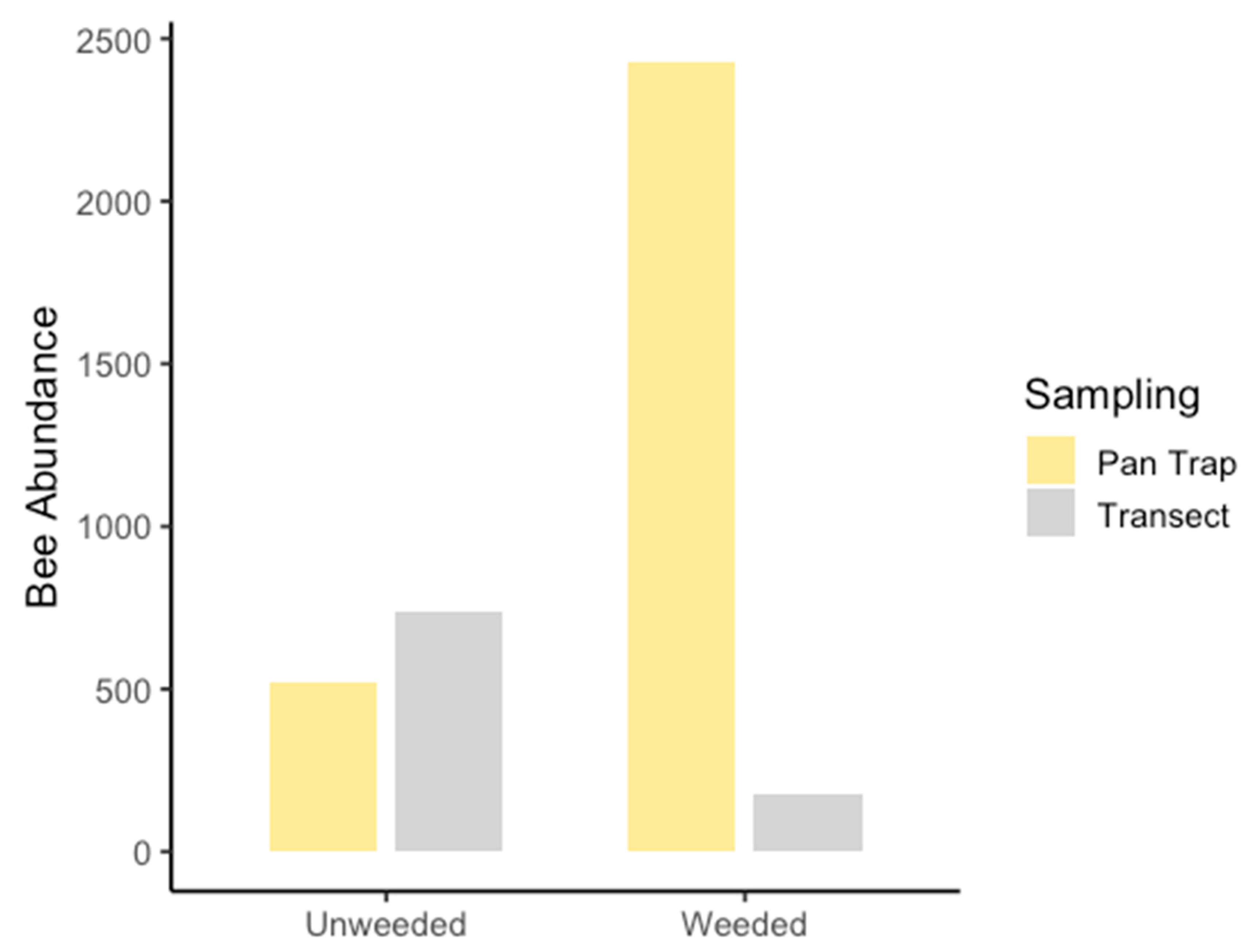 2.5. Impact of Orchard Management and Sampling Method on Bee Abundance