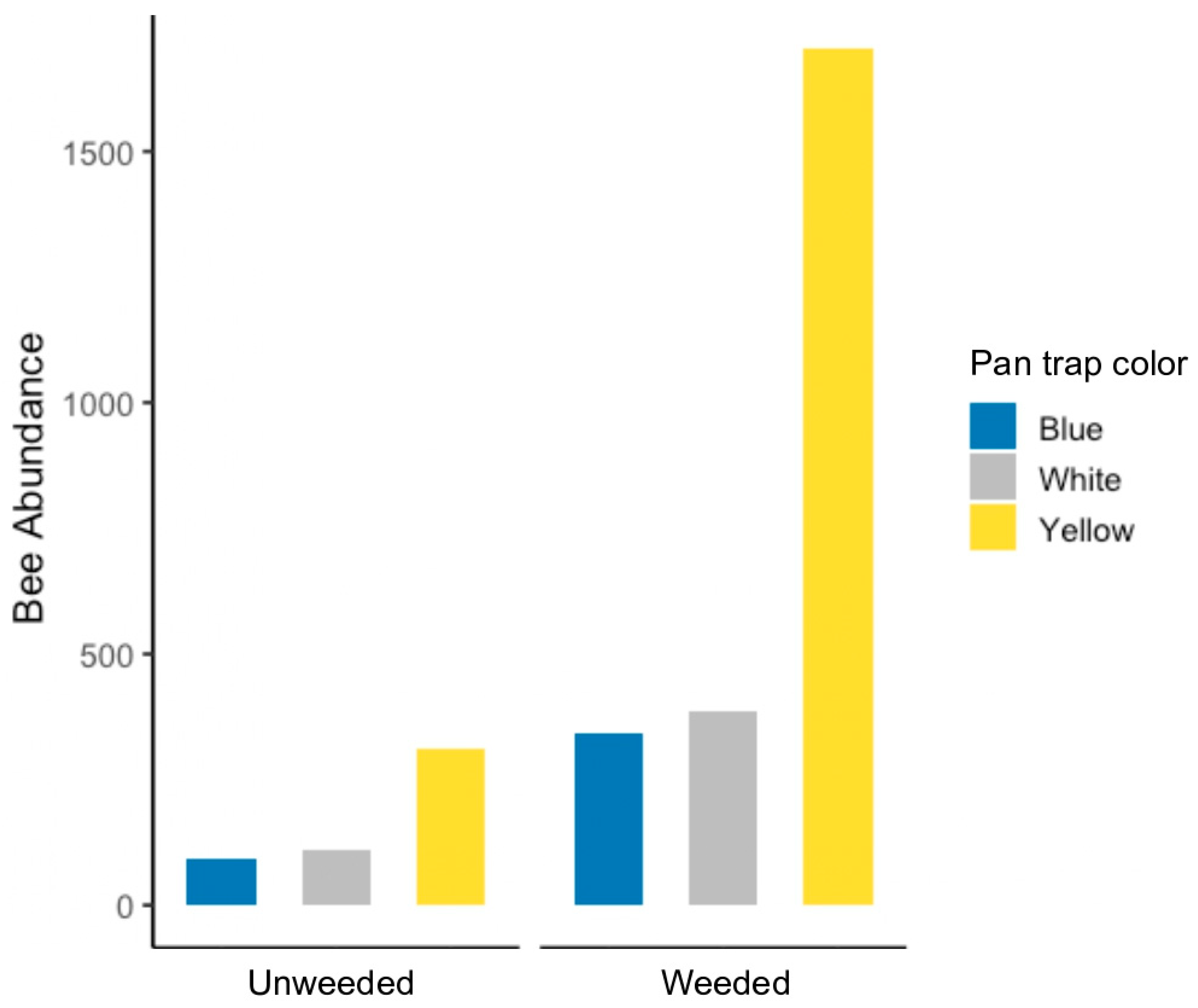 2.6. Impact of Color and Orchard Management on Bee Captures in Pan Traps