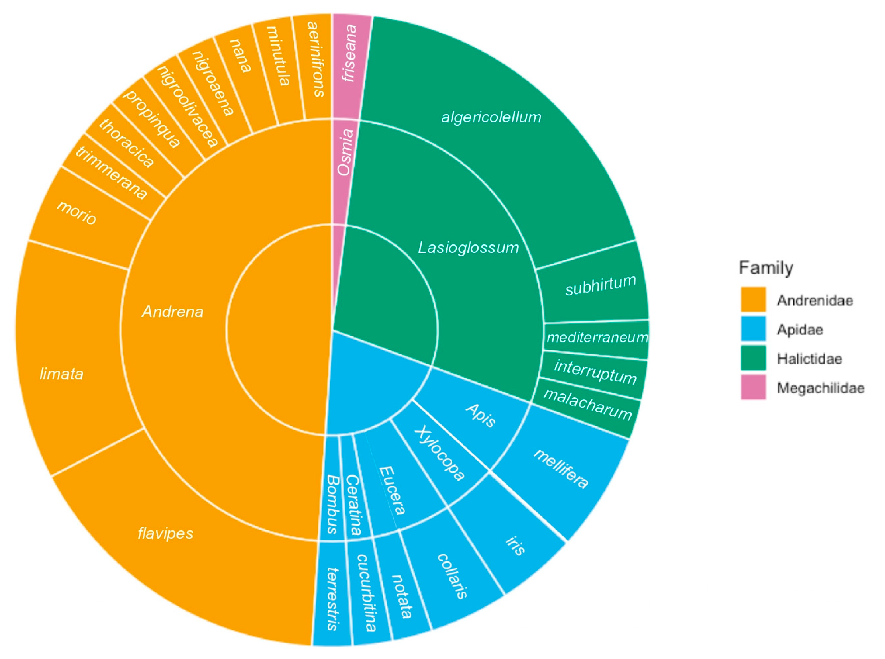 - Sentil, A.; Fiordaliso, W.; Michez, D. Relation between honey bee abundance and wild bee communities in Moroccan agro-ecosystems. Biodivers. Conserv. 2024, 34, 299–314. [Google Scholar] [CrossRef]