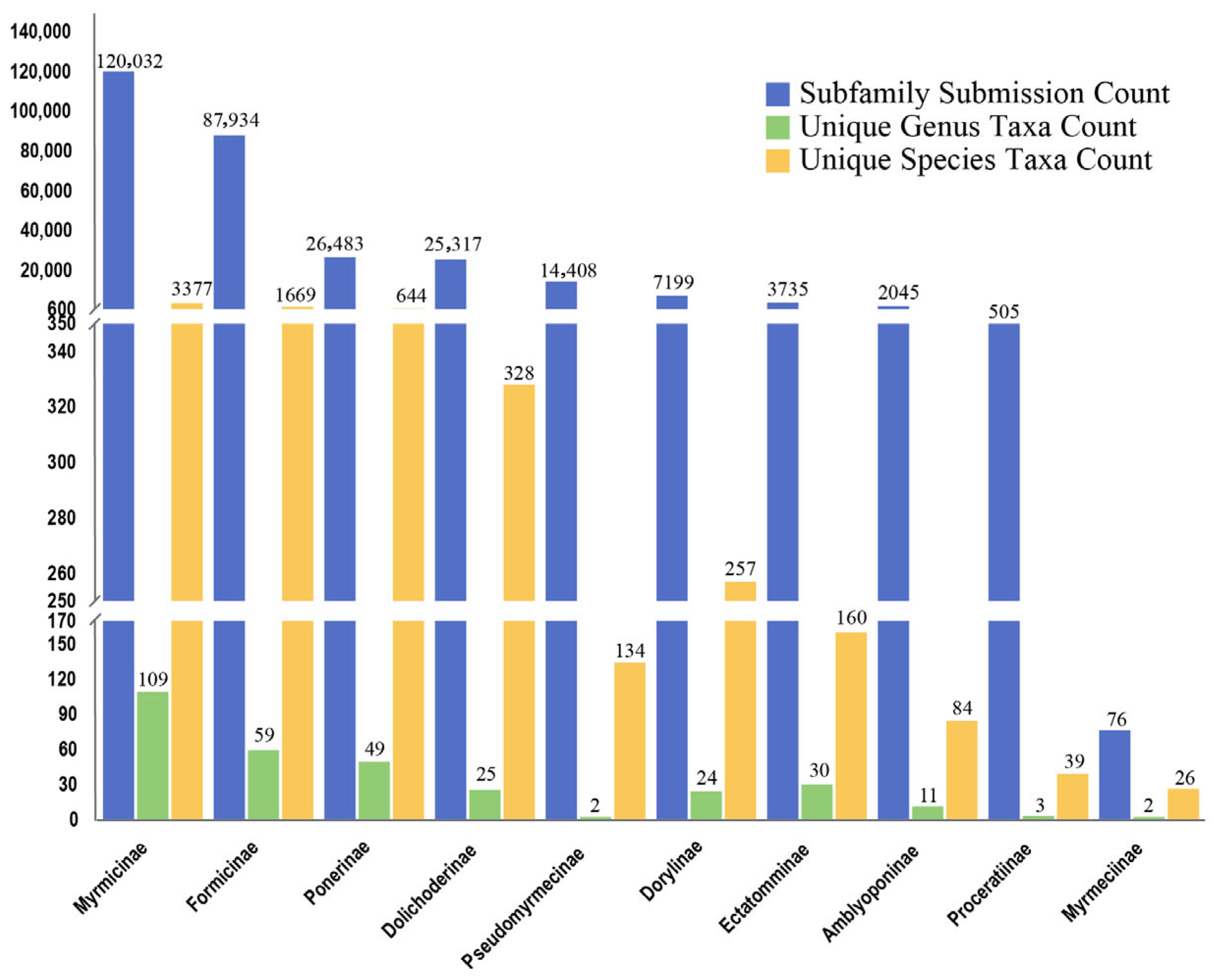 | Dorylinae | Dorylus, Eciton, Neivamyrmex, Nomamyrmex, Ooceraea, |