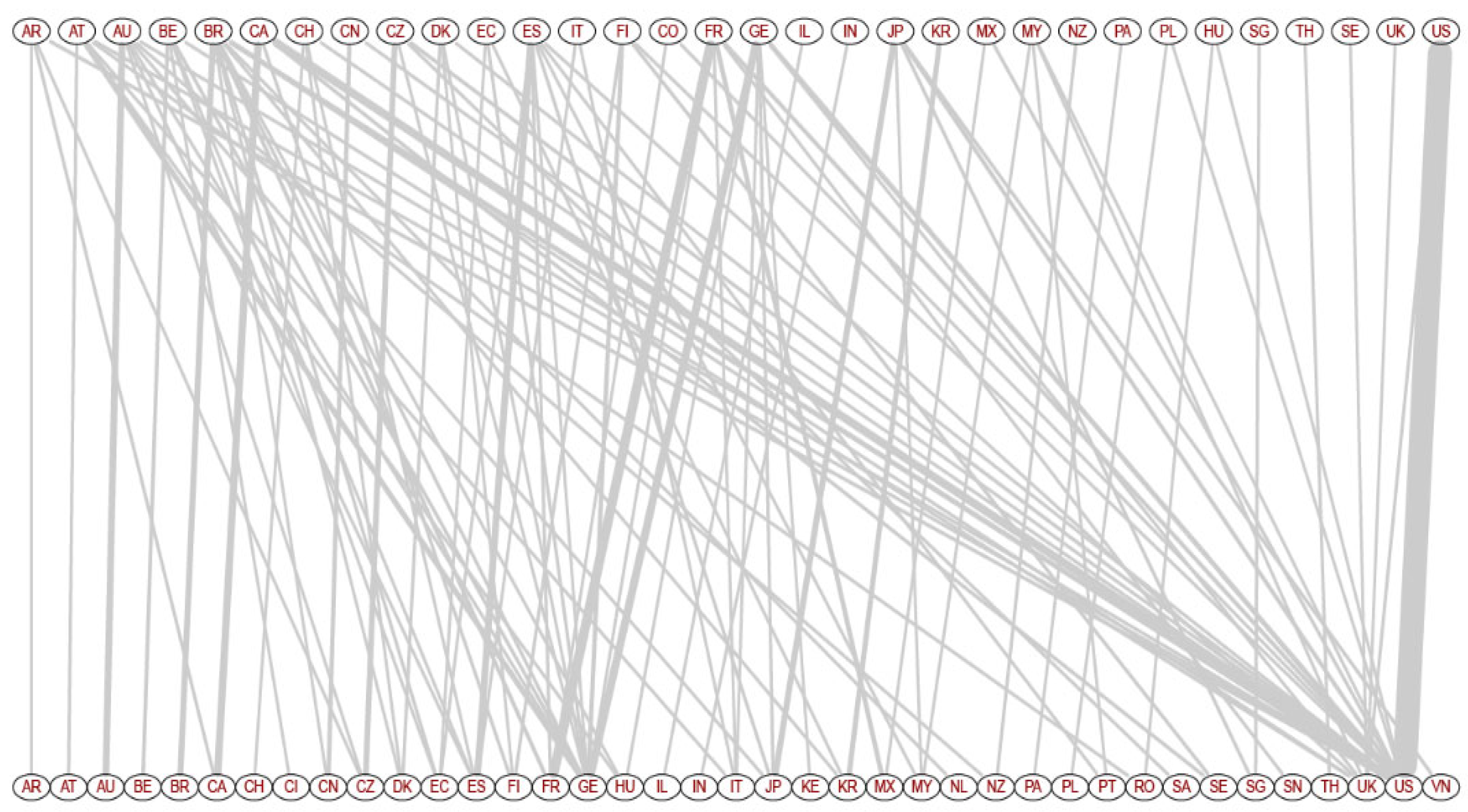 - Gui, Q.; Liu, C.; Du, D. Globalization of Science and International Scientific Collaboration: A Network Perspective. Geoforum 2019, 105, 1–12. [Google Scholar] [CrossRef]