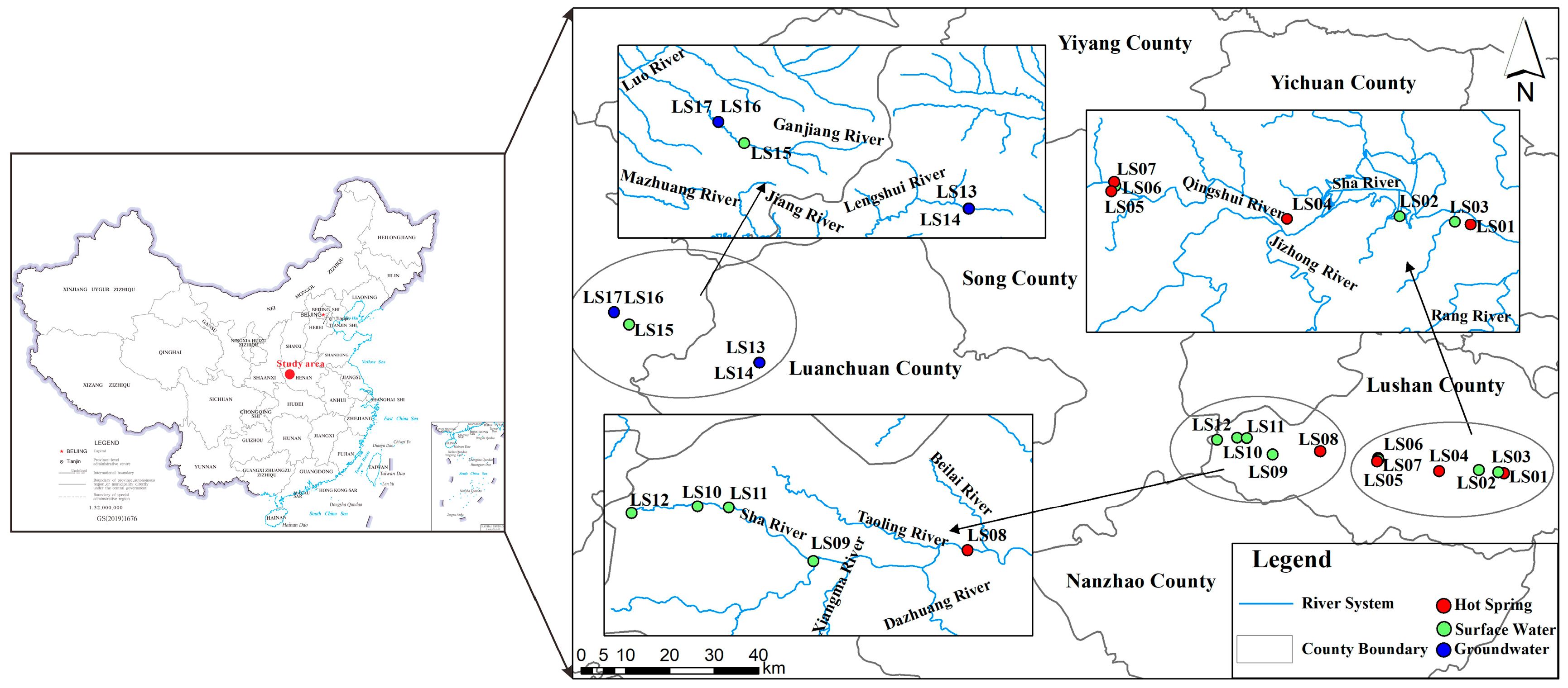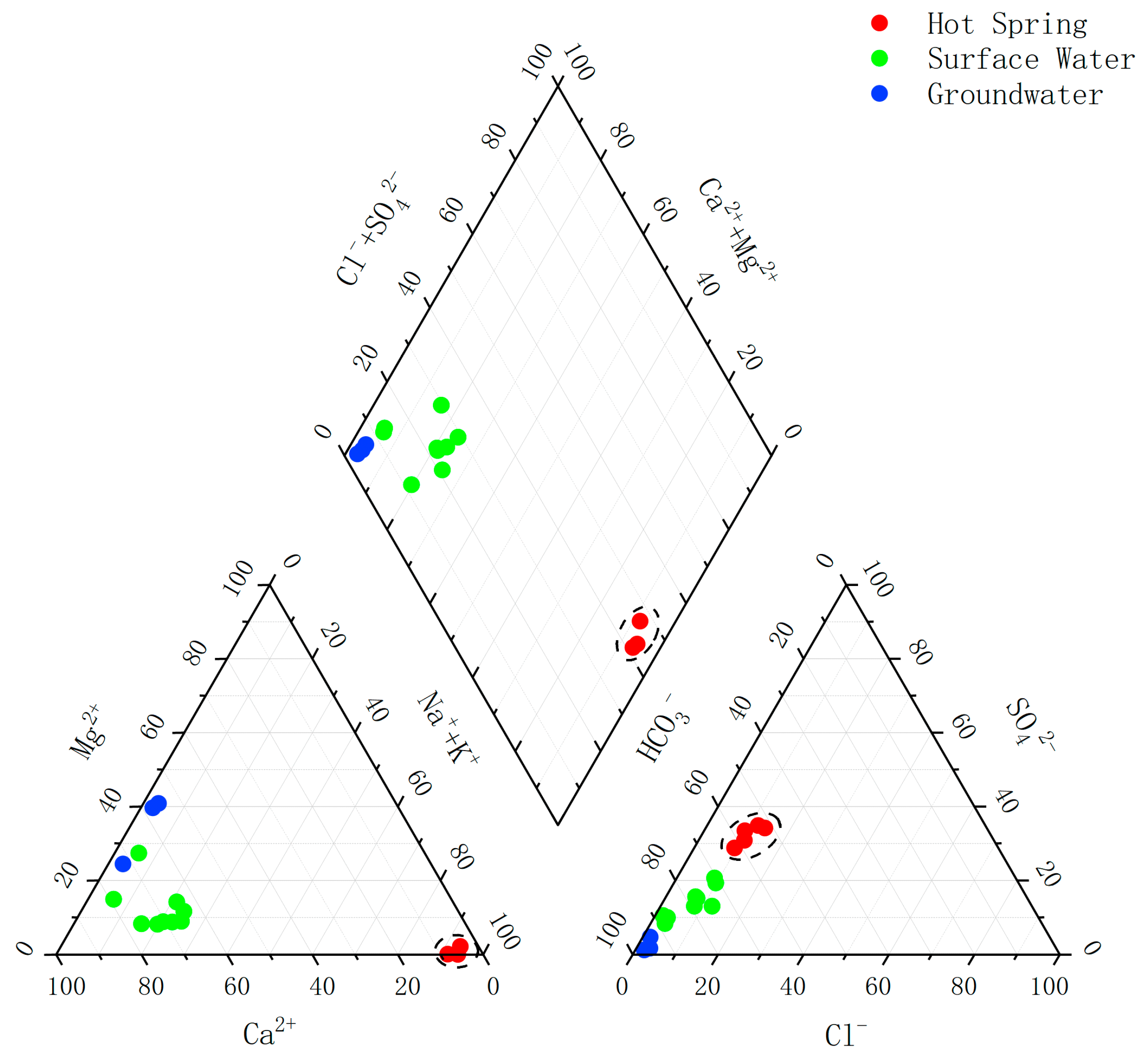 - Zhang, S.C.; Liu, K.; Wang, L.Y.; Zhu, W.; Deng, Y.F.; Yu, C.H. Identifying the hydrochemical characteristics and genetic mechanism of medium-low temperature fluoride-enriched geothermal groundwater in the Hongjiang—Qianshan Fault of Jiangxi Province. Rock Mineral. Anal. 2024, 43, 568–581. [Google Scholar]