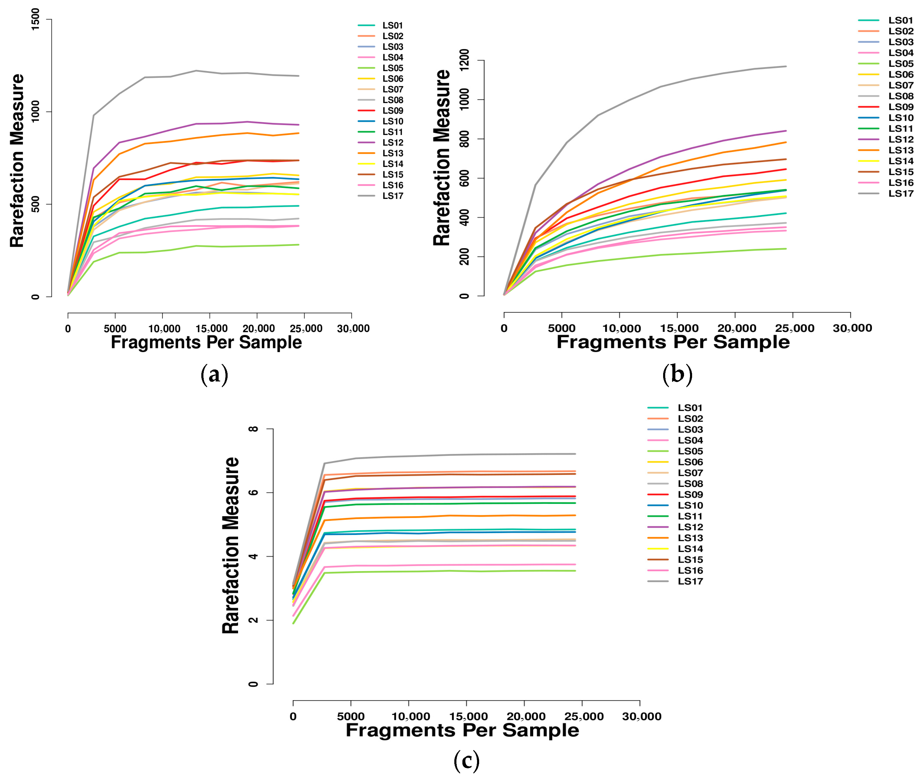 - Caporaso, J.G.; Kuczynski, J.; Stombaugh, J.; Bittinger, K.; Bushman, F.D.; Costello, E.K.; Fierer, N.; Peña, A.G.; Goodrich, J.K.; Gordon, J.I.; et al. QIIME allows analysis of high-throughput community sequencing data. Nat. Methods 2010, 7, 335–336. [Google Scholar] [CrossRef]