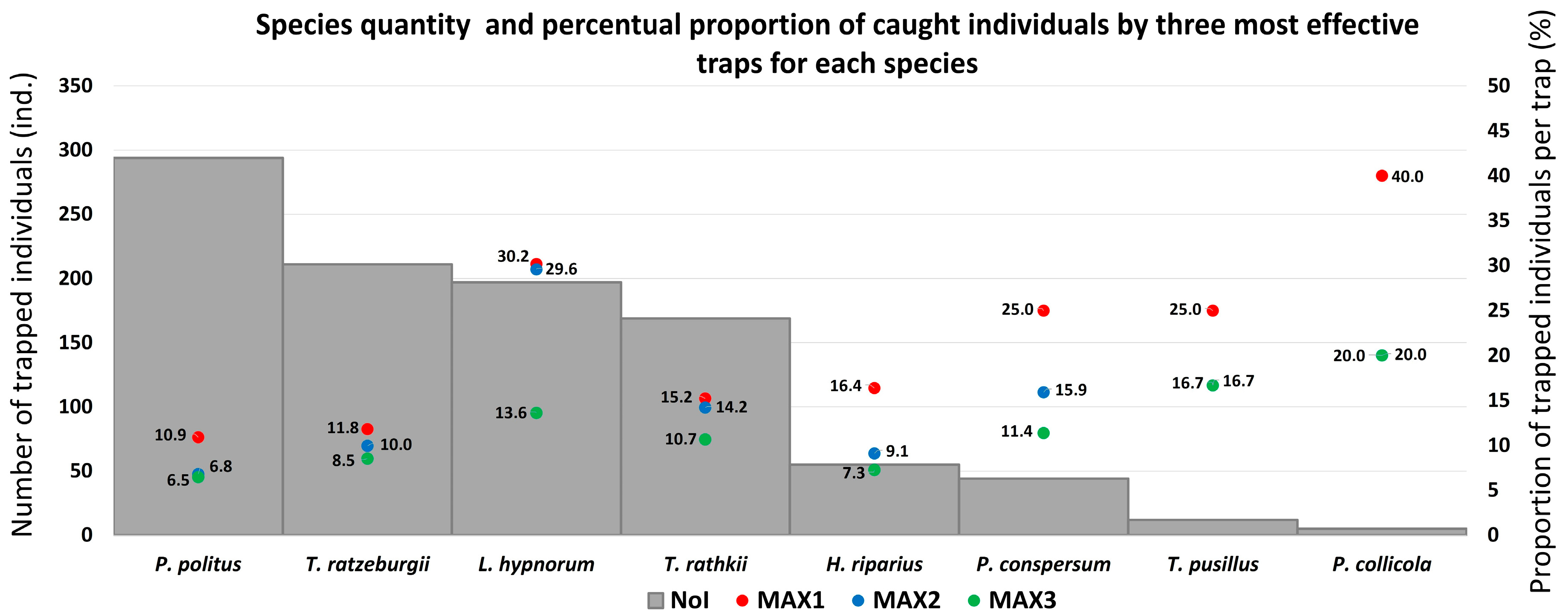 Figure 2. Quantity of individuals (main axis with species columns) and percentage of individuals captured by the three most effective traps (secondary axis and MAX1, MAX2, MAX3 dots). The effectiveness of each trap is evaluated for each species separately, not for the whole community.