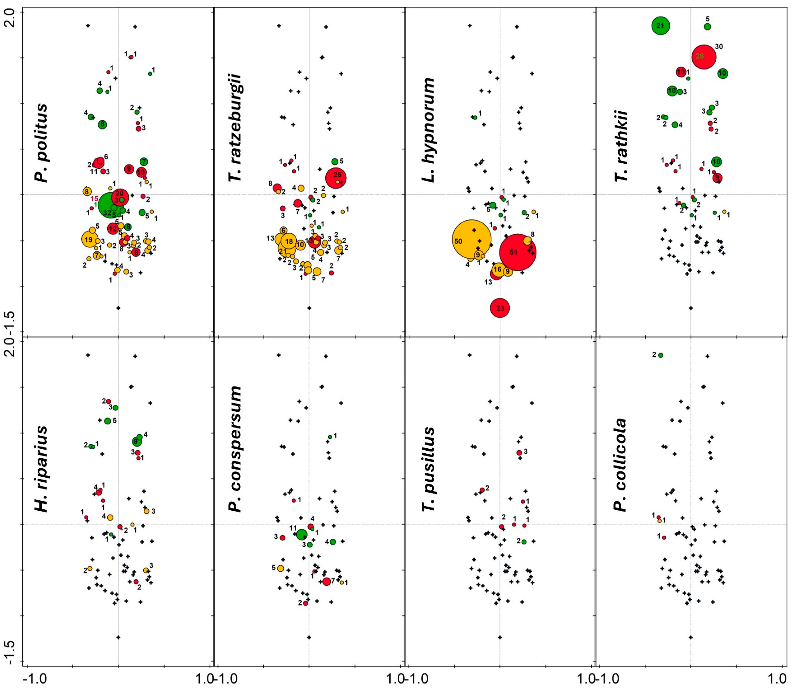P. politusT. ratzeburgiiL. hypnorumT. rathkiiH. ripariusP. conspersumT. pusillusP. collicola