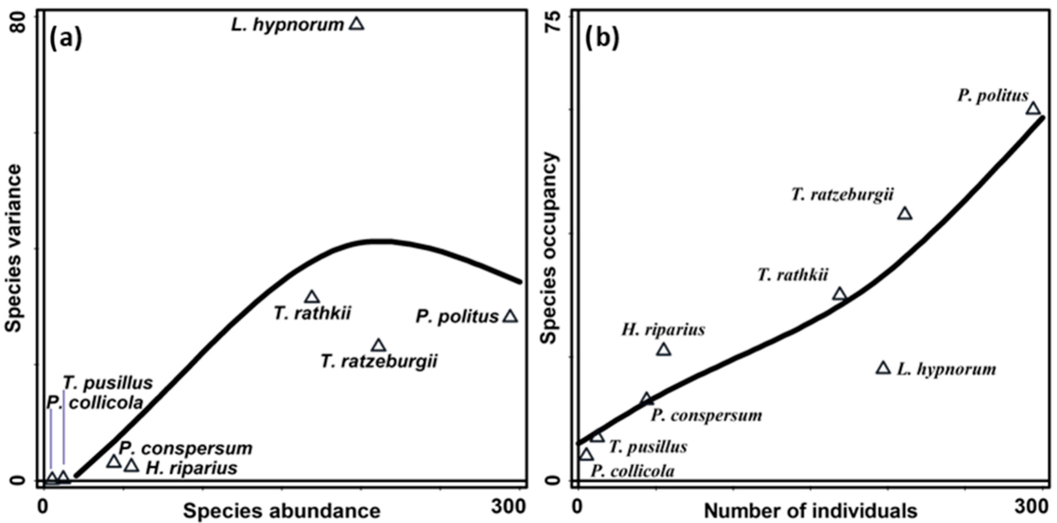 We observed the well-known positive abundance–variance and abundance–occupancy relationships, the latter being strongly significant. However, highly clumped species with narrow ecological valence (e.g., L. hypnorum) may disrupt these patterns by combining environmental sensitivity with high local abundance. This raises the question of actual versus putative dominance and how it should be defined across spatial scales [2,18,19]. Even without a full trivariate abundance–variance–occupancy model, the very low occupancy and extremely high local abundance of L. hypnorum likely exerted a strong influence on the variance parameter, producing the observed deviation in abundance–variance–occupancy space as well [19,20]. Moreover, despite substantial differences in clumping across habitats and species, the pronounced variance in L. hypnorum may explain the non-significant results in tests of those differences.