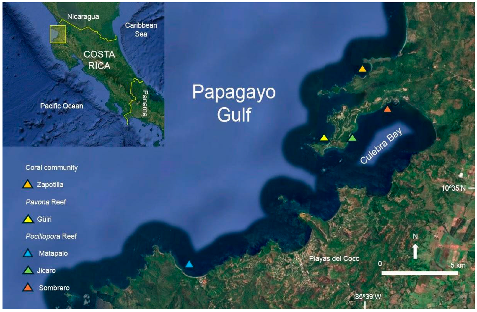 - Jiménez, C.; Bassey, G.; Segura, A.; Cortés, J. Characterization of the coral communities and reefs of two previously undescribed locations in the upwelling region of Gulf of Papagayo (Costa Rica). Rev. Cienc. Mar. Costeras 2010, 2, 95–108. [Google Scholar] [CrossRef]