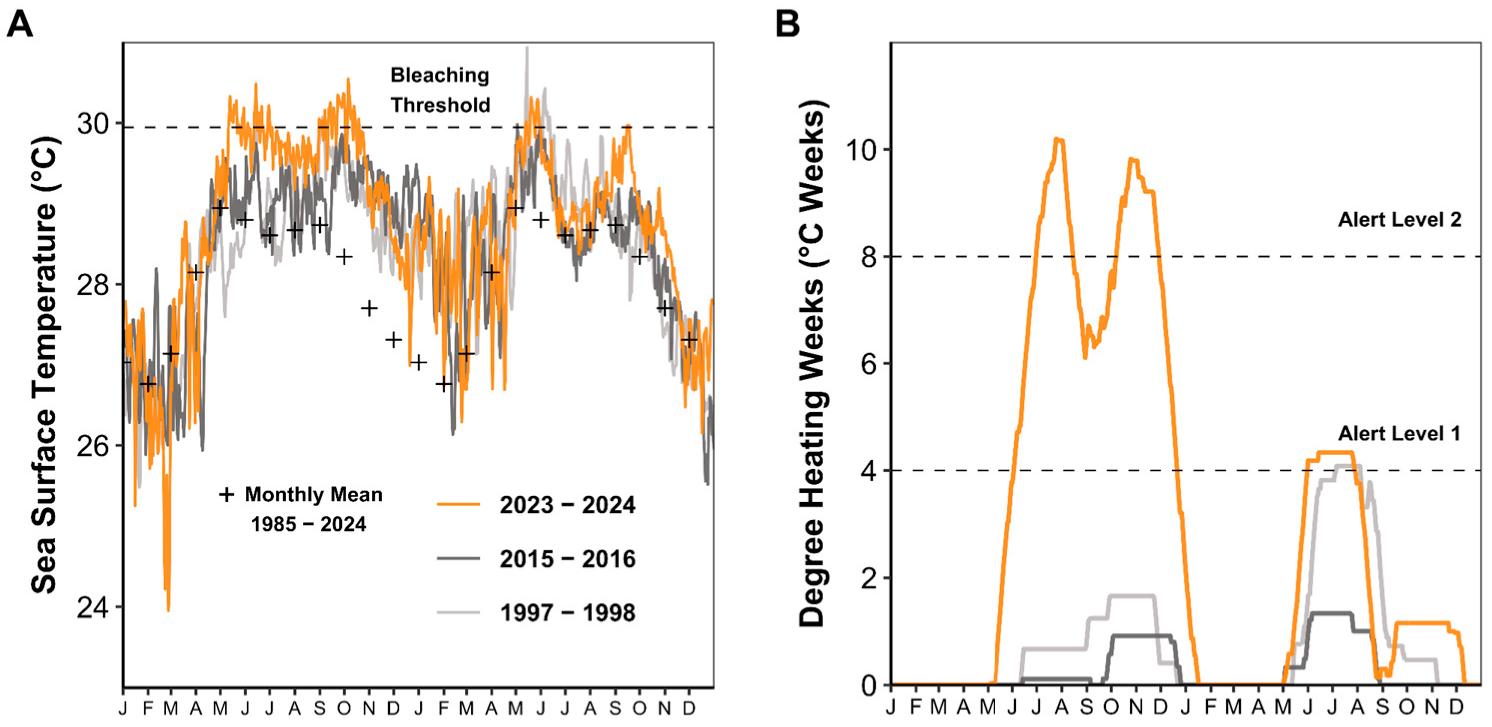 - Goreau, T.J.F.; Hayes, R.L. 2023 Record marine heat waves: Coral reef bleaching HotSpot maps reveal global sea surface temperature extremes, coral mortality, and ocean circulation changes. Oxf. Open Clim. Change 2024, 4, kgae005. [Google Scholar] [CrossRef]