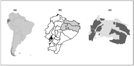 Location of the Northern Ecuadorian Amazon (NEA). (a) Map of South America showing Ecuador in gray; (b) Ecuador with the Northern Amazon region highlighted; (c) Detail of the NEA indicating protected areas in dark gray. Chakras and other crops occur in the light gray area in (c).