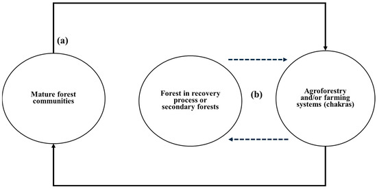 Conceptual diagram depicting the succession of shifting agriculture in the Northern Ecuadorian Amazon. (a) Cycle with long fallow periods; (b) Cycle with reduced fallow intervals.