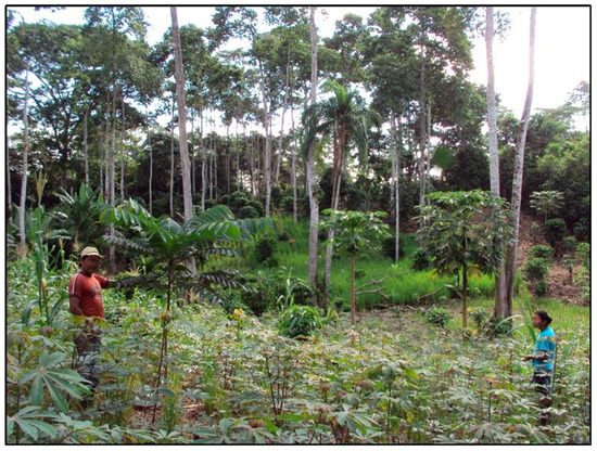 The dynamic structure between mature forests and chakras maintains significant levels of diversity. Notably the diversity in mature forest is limited by continuous modifications of tree strata (Figure 3). The photograph (Figure 3) illustrates a chakra established from a secondary forest in recovery, depicting an intermediate stage of land-use transition where forest regeneration and agroforestry coexist. This reflects the cyclical dynamics described in Figure 2, where forest recovery and chakra cultivation alternate as part of the shifting agricultural mosaic. It is worth noting that the proximity of chakras to protected reserves or extensive tracts of mature forest may also influence their floristic composition, with sites nearer to undisturbed areas generally exhibiting greater canopy diversity and faster regeneration. In contrast, landscapes dominated by commercial agriculture, timber extraction, or conventional shifting cultivation might have reduced canopy diversity and slower forest recovery. These practices, conducted by both Indigenous and non-Indigenous communities, though to different degrees, contributed to the lowering of species diversity across the region.