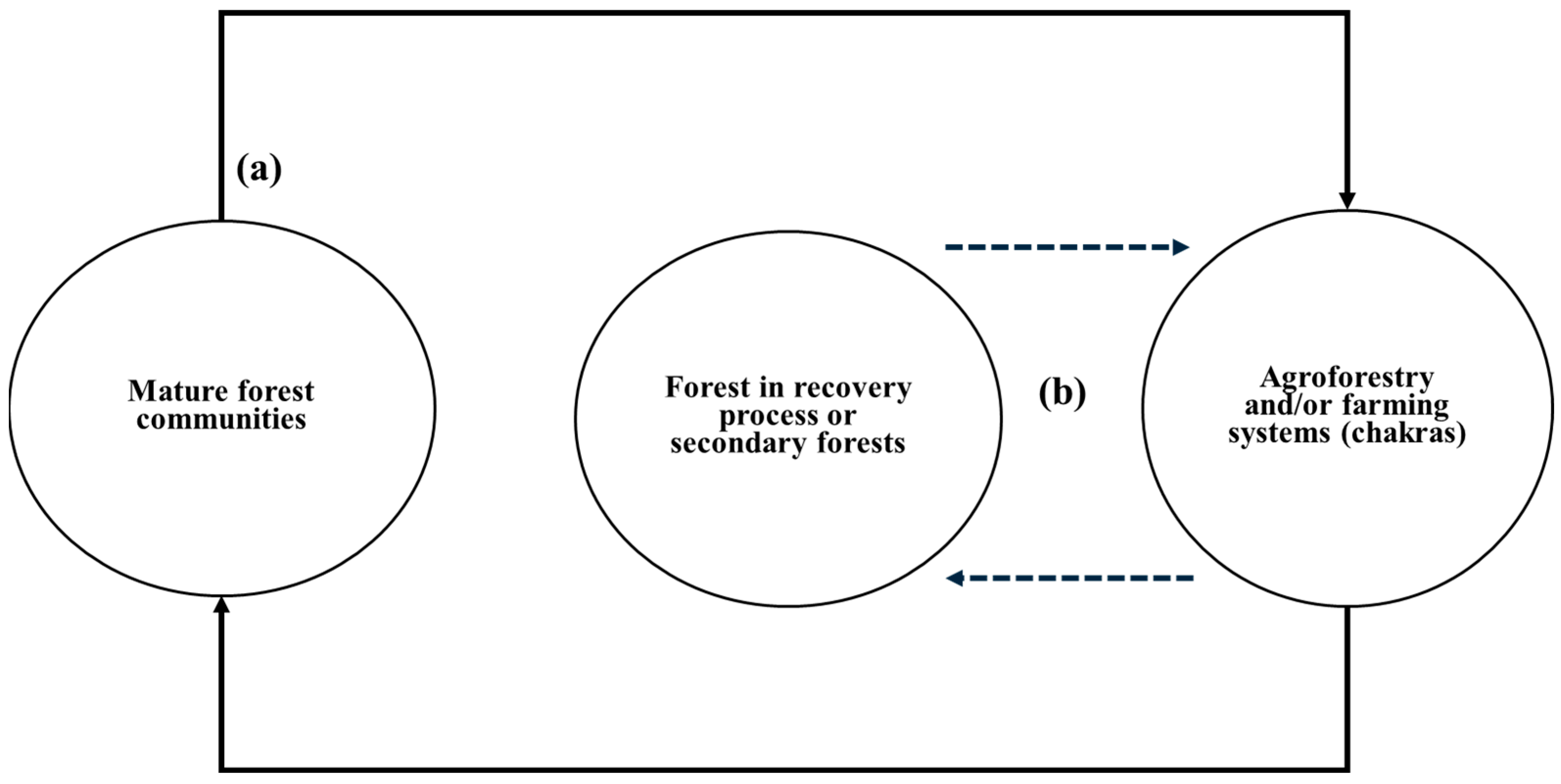 Among Indigenous groups, the Kichwa have developed the chakra system, an agroforestry practice that integrates production and conservation objectives (Table 3). According to Arévalo [60], chakras involve cultivating small forest openings for 2 to 25 years to meet household food and income needs, after which the plots are left fallow to allow forest and soil recovery (Figure 2a). A defining feature of these systems is the use of multi-layered shade gradients created by retaining native trees that support diverse plant assemblages and enhance microclimatic conditions [4]. These characteristics enable chakras to preserve native floristic diversity, though their specific contributions to the conservation of endemic and threatened species remain underexplored.