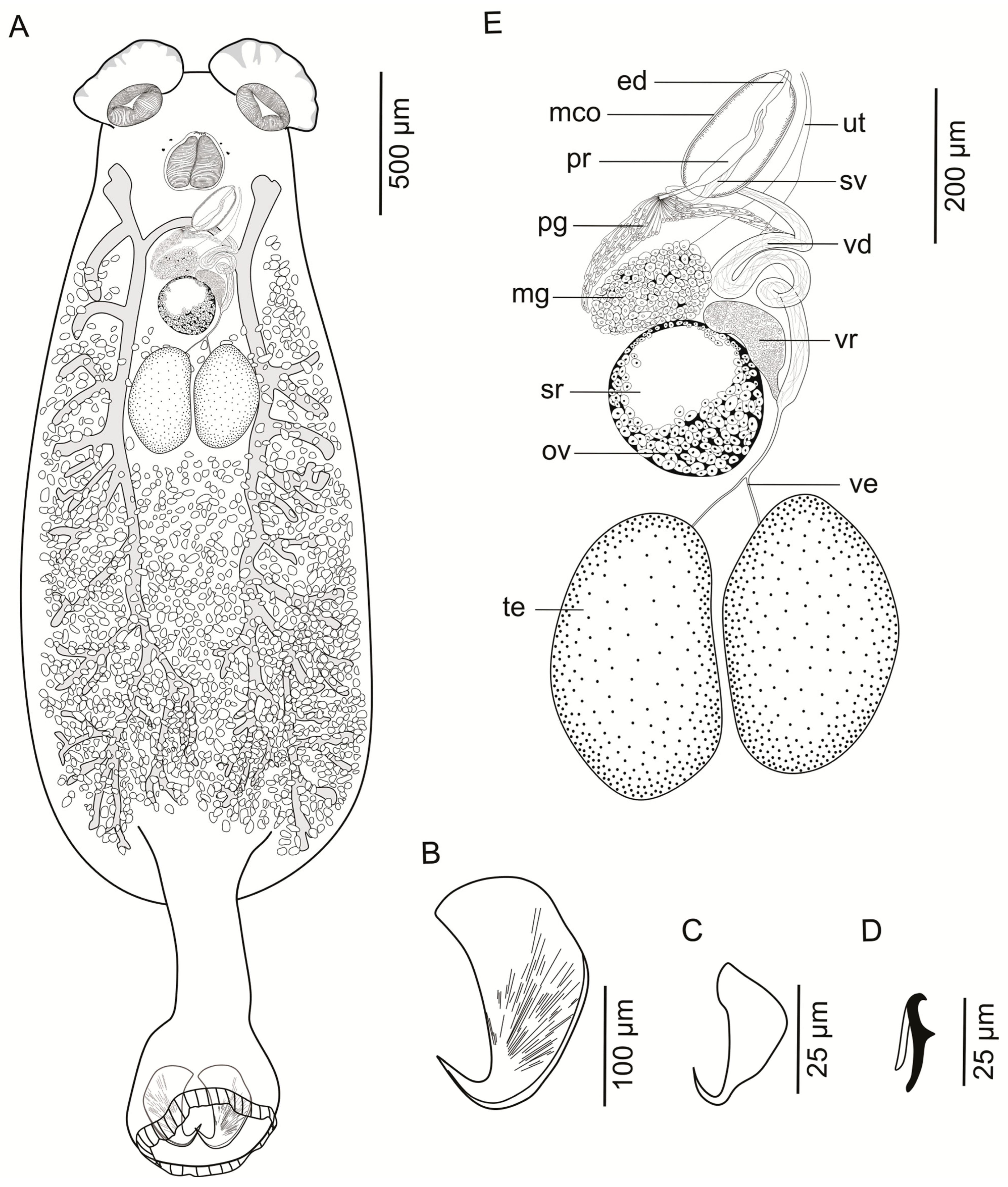 - Camargo, A.C.A.; Luque, J.L.; Santos, C.P. Mexicana rubra sp. nov. and Encotyllabe cf. spari off Rio de Janeiro. Helminthologia 2017, 54, 336–347. [Google Scholar] [CrossRef]