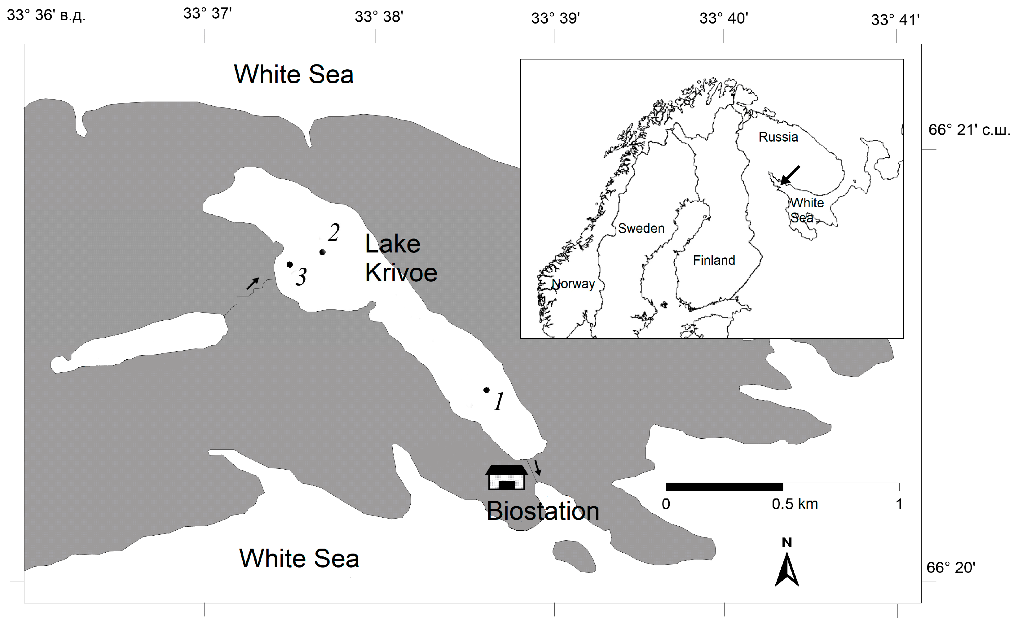 We applied SIA to analyze the food web in a subarctic cold-water lake on the White Sea coast (Lake Krivoe). We studied the structure of the food web during different times of the year, including the under-ice period. Although the biotic communities (plankton, benthos, and fish) in the lake have been investigated for over 50 years [17,18,19], these studies were mainly conducted during the open water period (from June to September). These previous studies were based mostly on pelagic food web compartments fueled by phytoplankton and allochthonous organic matter transformed by heterotrophic microorganisms [17,18], but benthic producers have not received much attention. At the same time, it has been found that benthic production plays an important role in maintaining higher trophic levels of consumers, such as fish [20,21]. The zoobenthyphagy are widespread, supporting fish production and causing competition and disruption of trophic dynamics in the pelagic zone [20].