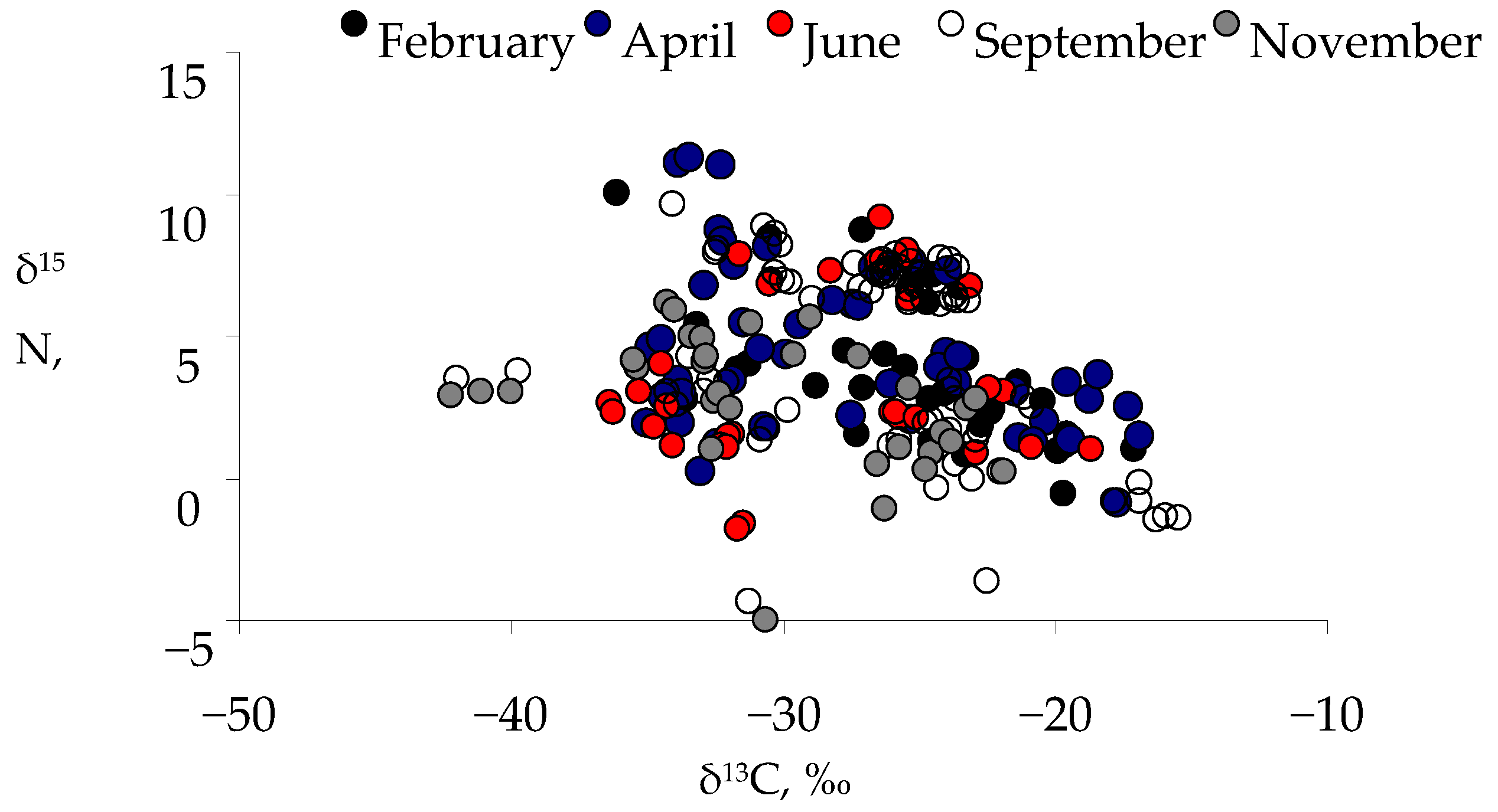 3.3. Seasonal Changes in Carbon and Nitrogen Stable Isotopes