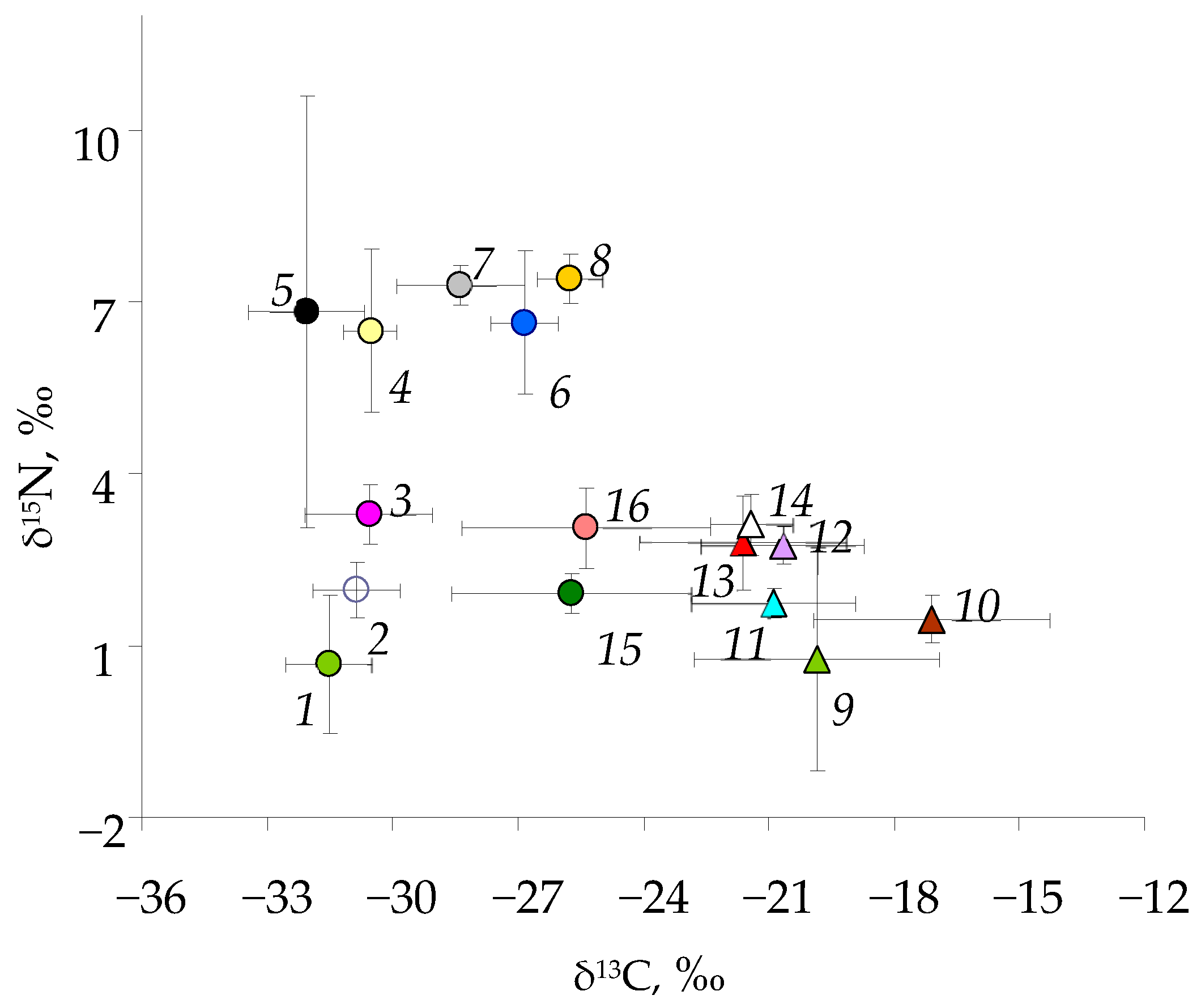 This work aimed to find the most important sources of carbon and nitrogen that feed the northern lake ecosystem, which is a model of oligotrophic clear-water lakes, and to estimate the contribution of photosynthetic carbon (produced by phytoplankton and benthic/periphytic algae) and alternative food resources (methane-derived carbon, diazotroph-derived nitrogen) to support the lake’s food web. Isotope studies of nitrogen-fixing aquatic organisms (such as cyanoprokaryotes) may help detect changes in nitrogen dynamics in the food web during nitrogen deficits. They may fix atmospheric nitrogen and integrate it into the food chains, restoring the trophic reserves. As atmospheric nitrogen has a δ15N value of 0, its presence in the food web can affect consumer isotopic ratios [22,23,24]. For example, cyanoprokaryotes Aphanizomenon flos-aquae fix atmospheric nitrogen (N2), and their nitrogen isotope ratio (δ15N) is closer to the atmospheric value of 0 than the values of δ15N in species that are unable to fix nitrogen N2. Their values of δ15N range from −1‰ to −2‰ [23]. This can lead to a decrease in the 15N content in the tissues of invertebrates that consume cyanobacteria. Consumers associated with carbon derived from methanotrophs also have depleted δ15N, as documented in lake chironomid larvae [5,10]. At the same time, they are characterized by depleted δ13C values (<−30‰) compared to other consumers in the food web [5,13].