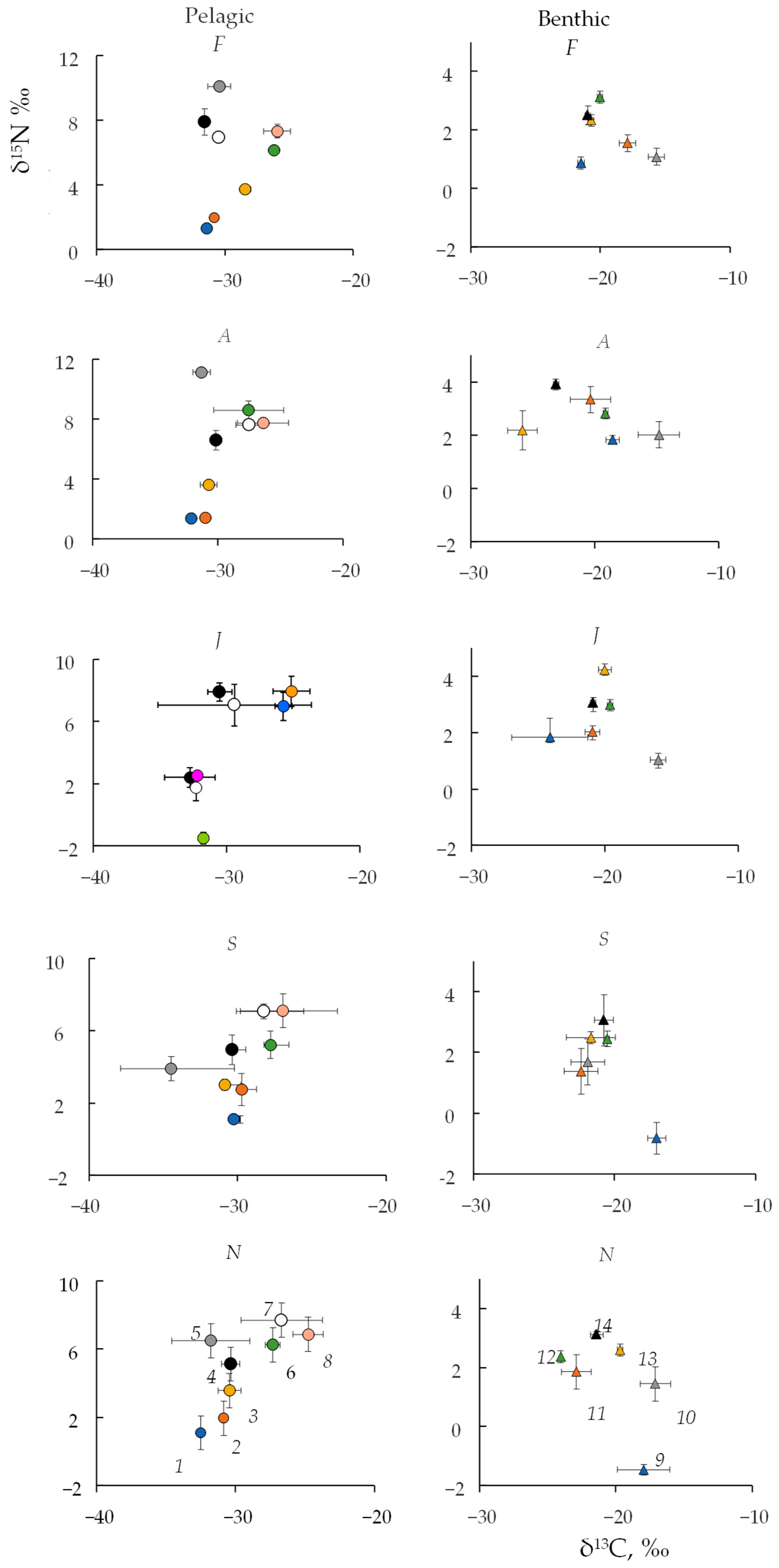 Figure 5. Biplots of δ13C and δ15N mean values (‰) ±1 SD for pelagic and benthic/littoral food web compartments in different seasons (F—February, A—April, J—June, S—September, N—November). The numbers of food web participants are the same as in Figure 4.