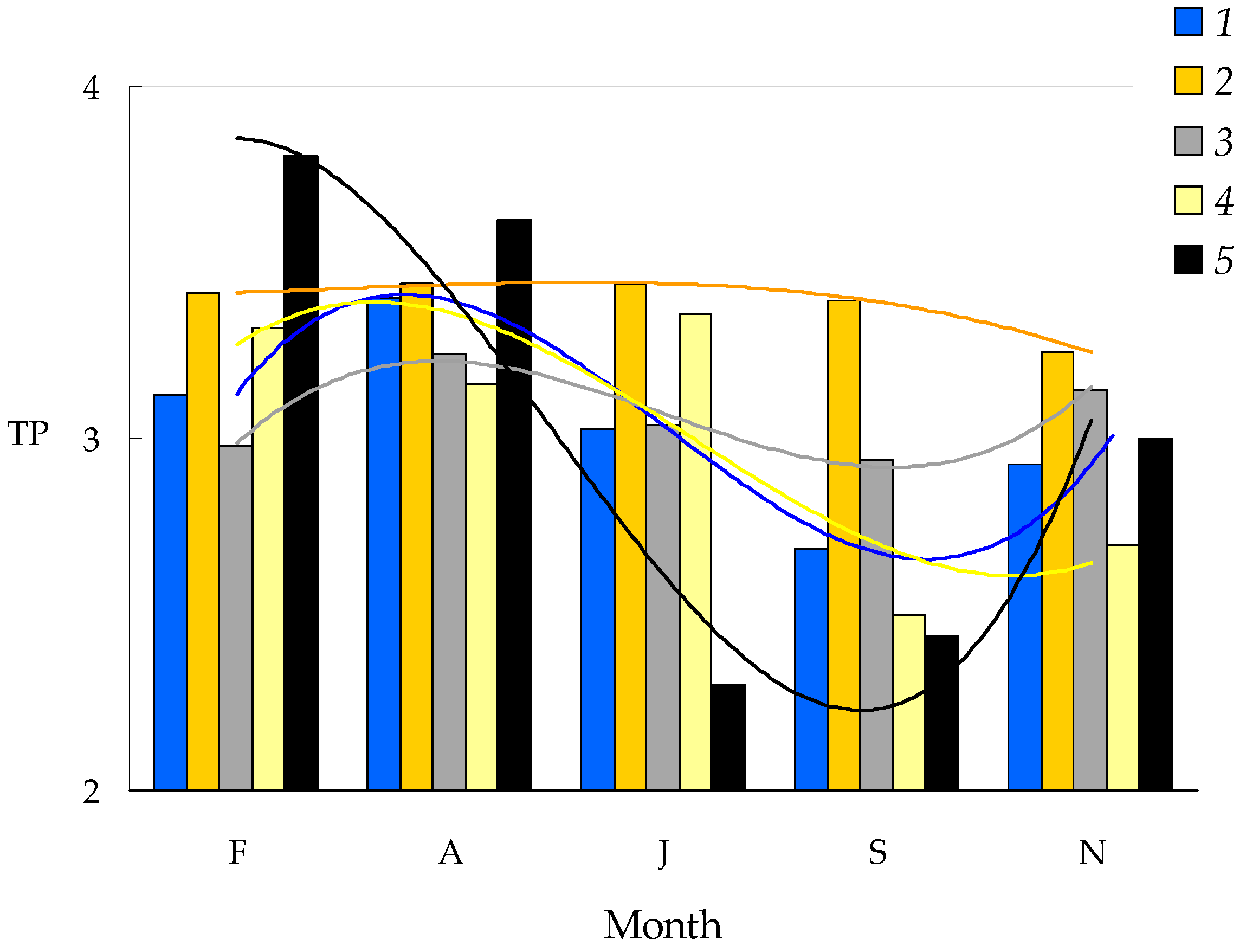 4.3. Seasonal Variations in δ15N Values and Trophic Positions of Consumers