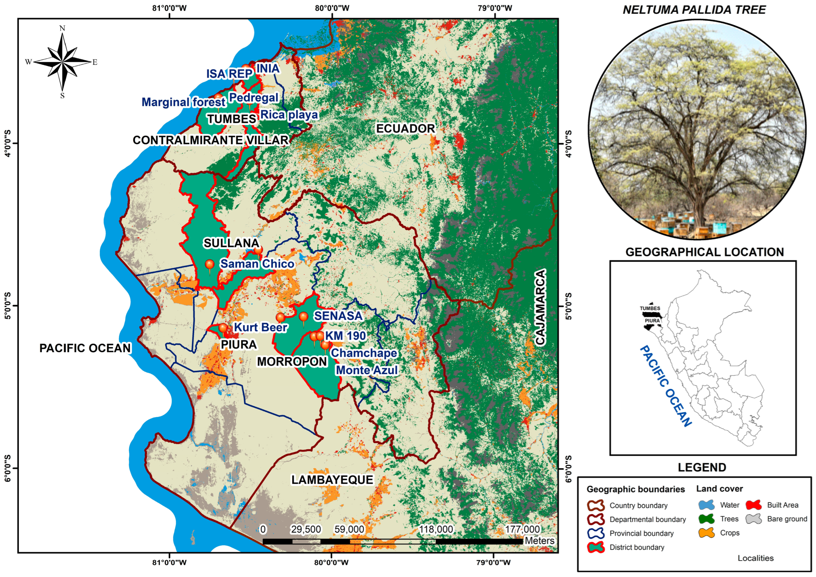 - Salazar, W.; Cruz-Grimaldo, C.; Lastra, S.; Rengifo, R.; Vargas-de-la-Cruz, C.; Godoy-Padilla, D.; Sessarego, E.; Cruz, J.; Solórzano, R. Nutritional Quality of the “Algarrobo” Neltuma pallida Fruit and Its Relationship with Soil Properties and Vegetation Indices in the Dry Forests of Northern Peru. Sustainability 2025, 17, 8296. [Google Scholar] [CrossRef]