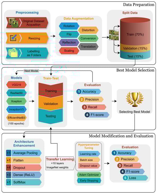 In the process of developing a system for plant recognition, the task has been performed in three stages, as shown in Figure 1. In the first stage, the original and augmented datasets were obtained. To construct the original dataset, the collected images were resized and arranged in folders, allocating one folder for each class. Later, the augmented dataset was obtained by using image augmentation techniques and applied to the original dataset without modifying it. In the second we chose state-of-the-art models renowned for their exemplary performance in image classification, as documented in existing literature. These models include VGG19 [], ResNet50 [], EfficientNetB3 [], Xception [], and InceptionV3 [] models were trained for 100 epochs using the same selected parameters. Using performance metrics, the models were evaluated, and the best model was selected. In the last stage, the best model was modified by adding ten layers. The obtained model was trained from scratch using ImageNet weights. To obtain better accuracy, hyperparameter tuning was performed. After obtaining targeted performance metrics, the early stop parameter was activated to find the optimum number of epochs needed for training, which aids in the efficient utilization of resources.