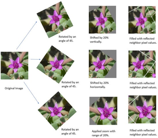 When dealing with CNN models, the quantity of images plays an important role in the training success of the architectures. The insufficient quantity of images in the training dataset exposes the model to learning patterns with very high variation, resulting in poor predictions on test data. This case is recognized in the literature as overfitting []. There are functional techniques in the literature to solve the overfitting problem, such as batch normalization, dropout regularization, and early stopping and transfer learning, which have been developed and applied to training on small datasets. Data Augmentation is not just reducing overfitting; it also addresses the core cause of poor generalization of the problem by artificially boosting the training dataset size through data warping or oversampling []. The image augmentation algorithms are mainly classified into three main categories such as model-free, model-based, and policy-based algorithms. In our study, we used a model-free approach because it does not need any pre-trained model to do image augmentation and can be used even for a single image. Geometrical transformation applied to a single image is one of the model-free approaches, which include operations such as rotation, flip, conversion, translation, reflection, elastic distortion, and scaling. Intensity transformation is also a model-free approach that includes techniques such as blurring, cutout, random erasing, and grid mask. In our study, we applied model-free geometrical transformation using built-in preprocessing functions in the Keras Library. For creating new instances of images, each original sample was rotated by an angle of 45, shifted by 20% horizontally and vertically, with a zoom range of 20%. The gaps formed after these geometrical transformations were filled with neighbor pixel values using reflection parameters, as shown in Figure 3. Later, the augmented dataset was split into training, validation, and testing datasets using a ratio of 70/15/15 as shown in Table 2.