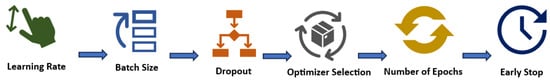In this research, we compared the results of the Adam optimizer to other available optimizers in the Keras library for the obtained dataset. Steps applied for hyperparameter tuning are given in Figure 5.