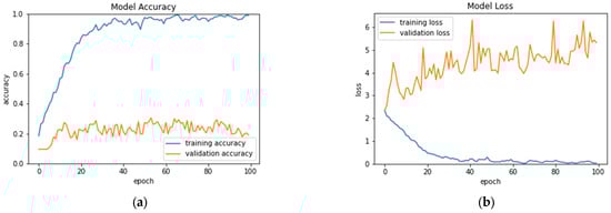 Figure 6a illustrates a gradual increase in accuracy during model training with each epoch. Conversely, in the case of validation accuracy, a consistent downward trajectory is observed with each epoch. This trend is further evident when examining the training and validation loss values depicted in Figure 6b, where low loss values are observed during training, contrasting with an increase during the validation process. These patterns suggest a potential overfitting challenge, emphasizing the need for strategies to mitigate this issue.