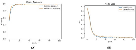 Figure 8 presents the training and validation behavior of PTL-Inception over 100 epochs. In Figure 8A, the training and validation accuracies are shown. The model began with a training accuracy of 48%, indicating limited alignment between initial predictions and the true labels. Accuracy increased rapidly during the early iterations, reaching its maximum within 32 epochs, which demonstrates quick adaptation to the dataset. Validation accuracy, starting from 51%, followed a similar trend and achieved 99.46% by the 31st epoch. After approximately the 38th epoch, both curves stabilized and remained relatively steady until the 100th epoch. This behavior indicates that the model had reached convergence, with consistent predictive performance on both training and validation sets. The stabilization also suggests the possibility of overfitting if training were to continue for substantially longer, as further specialization could reduce generalization to new data.