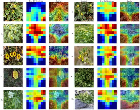 To further interpret model predictions and confirm that PTL-Inception relied on taxonomically relevant features, we generated explainability visualizations using Grad-CAM (Figure 10). The results clearly indicated that the model consistently focused on plant morphology (leaf arrangement, floral structures, branching) while minimizing attention to non-relevant background elements such as soil, rocks, or shadows. This provided additional confidence that classification decisions were biologically meaningful rather than being driven by environmental cues.