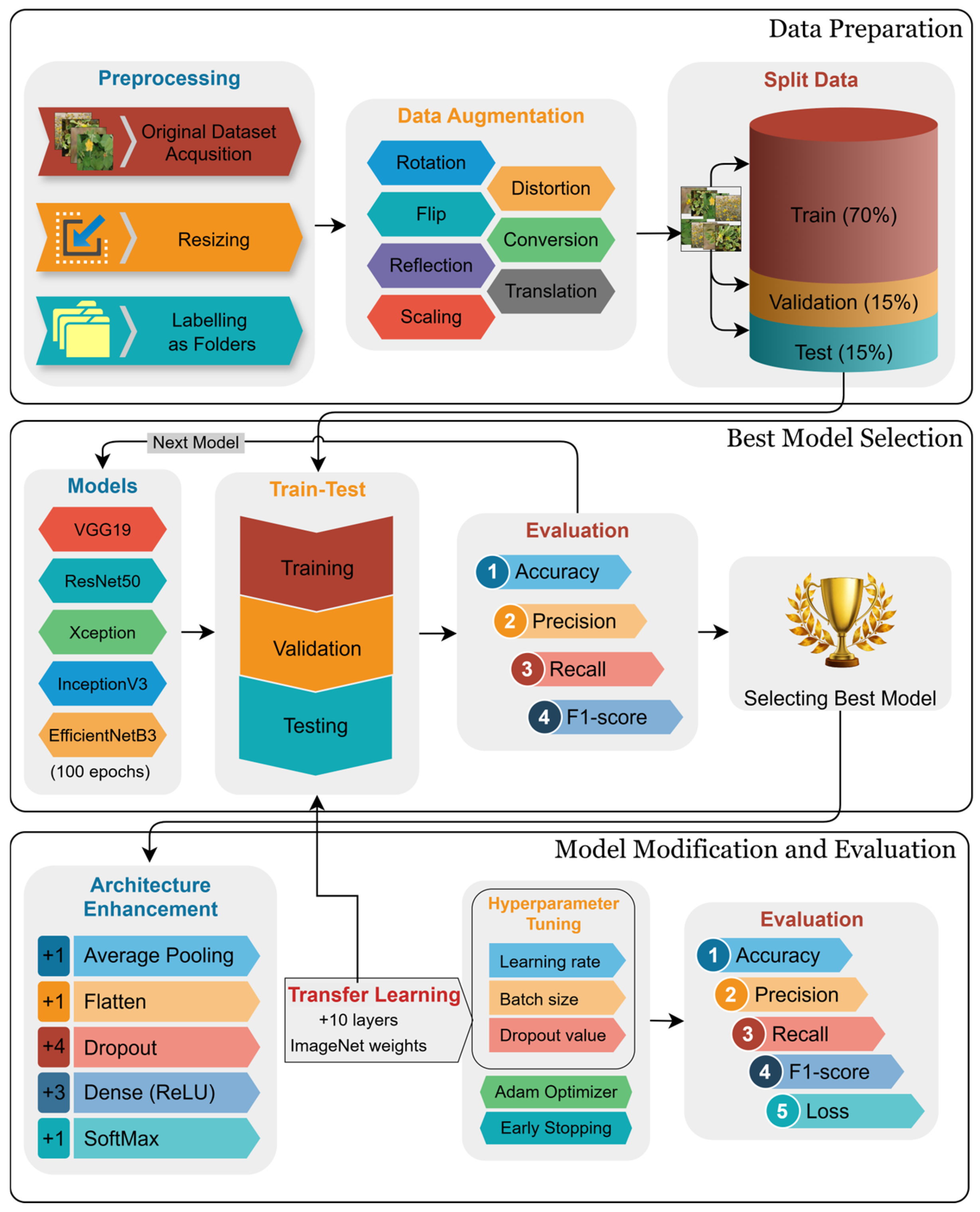Figure 1. In the first stage, the original and augmented datasets were obtained. To construct the original dataset, the collected images were resized and arranged in folders, allocating one folder for each class. Later, the augmented dataset was obtained by using image augmentation techniques and applied to the original dataset without modifying it. In the second we chose state-of-the-art models renowned for their exemplary performance in image classification, as documented in existing literature. These models include VGG19 [