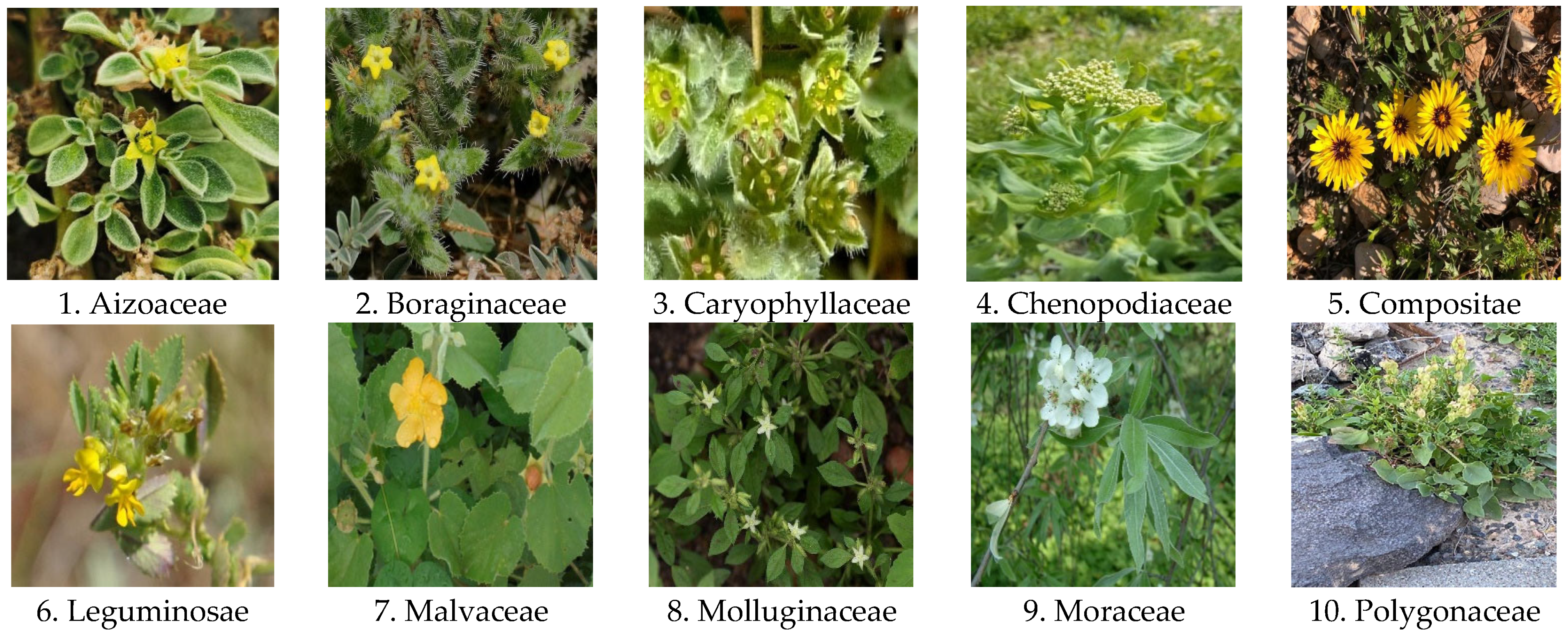Figure 2 presents a selection of sample images from the ten families, highlighting both the diversity of plant features and the demanding nature of their natural surroundings.