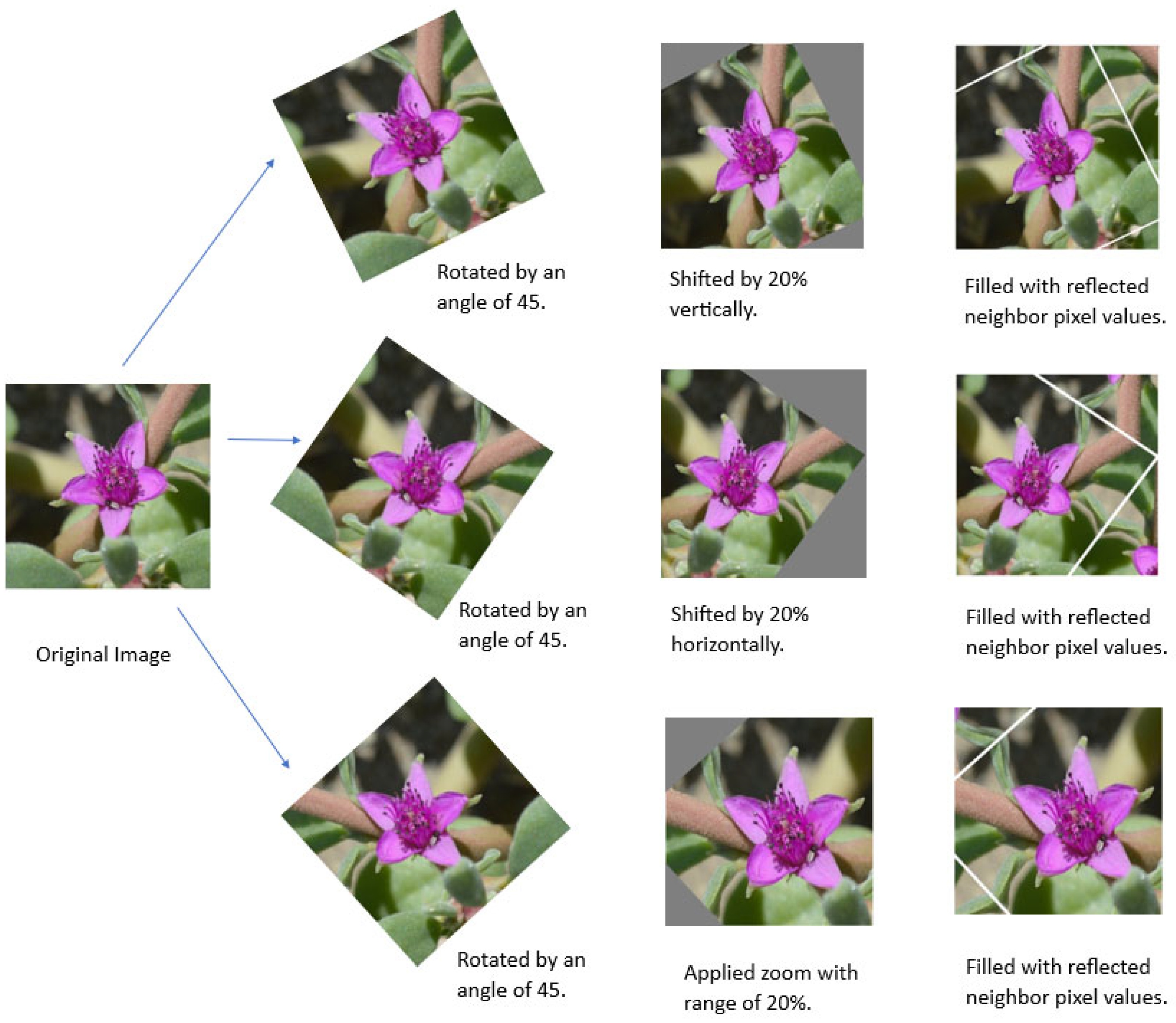 35]. The image augmentation algorithms are mainly classified into three main categories such as model-free, model-based, and policy-based algorithms. In our study, we used a model-free approach because it does not need any pre-trained model to do image augmentation and can be used even for a single image. Geometrical transformation applied to a single image is one of the model-free approaches, which include operations such as rotation, flip, conversion, translation, reflection, elastic distortion, and scaling. Intensity transformation is also a model-free approach that includes techniques such as blurring, cutout, random erasing, and grid mask. In our study, we applied model-free geometrical transformation using built-in preprocessing functions in the Keras Library. For creating new instances of images, each original sample was rotated by an angle of 45, shifted by 20% horizontally and vertically, with a zoom range of 20%. The gaps formed after these geometrical transformations were filled with neighbor pixel values using reflection parameters, as shown in