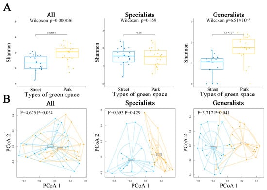 The diversity of all AMF and generalized AMF showed a significant difference between the two types of green spaces (p < 0.05), with park green spaces having a higher Shannon diversity index than street ones. However, specialists exhibited no significant differences in their diversity (Figure 3A). All AMF and generalized AMF also exhibited significantly varying community structure between the two types of green spaces (Figure 3B) (all: F = 4.675, p = 0.034; generalists: F = 3.717, p = 0.041). However, no significant difference was found in the community structure of specialist species (F = 0.653, p = 0.429).