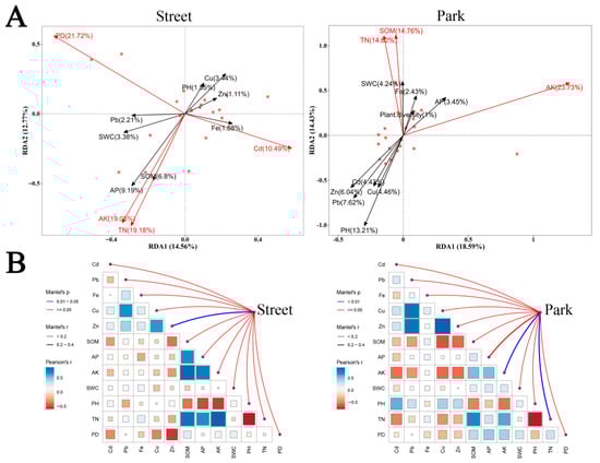 The influence of environmental factors on AMF communities in different types of green spaces. (A): Redundancy Analysis (RDA) of AMF community composition and environmental factors in street and park green spaces. Red arrows indicate significant environmental factors (p < 0.05). (B): Environmental associations of AMF communities in street and park green spaces. The thickness of the lines represents the strength of the correlations. Note: PD represents plant diversity.