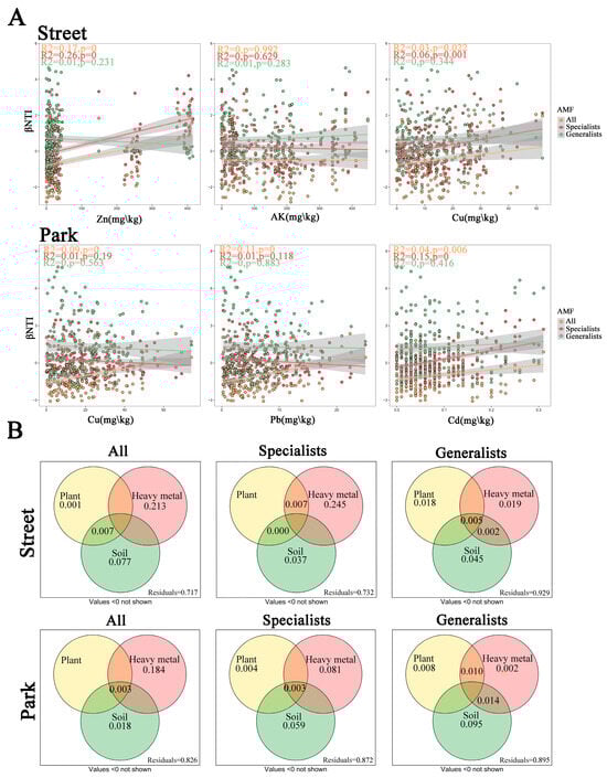In street green spaces, the Zn and Cu concentrations formed significant positive correlations with the βNTI of all AMF and generalized AMF, which suggested that the increased levels of Zn and Cu resulted in the transition from stochastic to deterministic processes in the assembly of all AMF and generalized AMF in street environments. Park green spaces presented significant positive correlations of the concentrations of Cu, Pb, and Cd with the βNTI of all AMF, which indicated that these elevated concentrations of these heavy metals prompted a shift in the AMF community assembly from stochastic to deterministic processes (Figure 6A). Furthermore, according to variance partitioning analysis, all environmental factors—including plants, heavy metals, and soil physicochemical properties—collectively explained 28.3% and 17.4% of the total variation in the βNTI of all AMF in street and park green spaces, respectively. Notably, heavy metals accounted for a higher proportion of variation in AMF community assembly than plant and soil variables in both street and park green spaces, contributing 21.3% and 18.4%, respectively (Figure 6B).