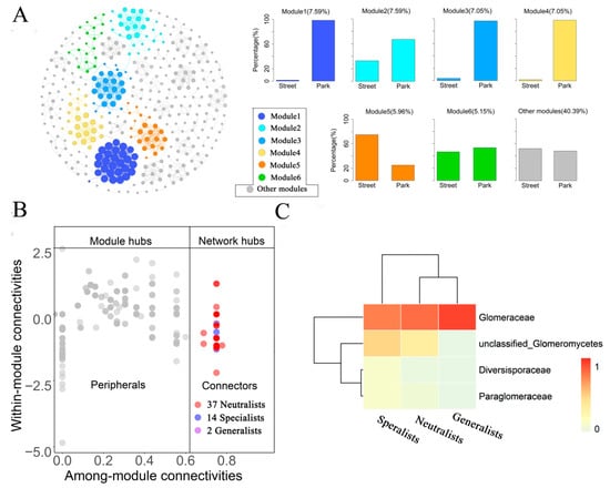 Stability of network modules across various types of green spaces in heavy metal-polluted urban green space ecosystems. (A): Network of modular associations between AMFs (left). The relative abundance of AMF in major network modules of street and park green spaces (right). Nodes are colored based on modularity, with each node representing a specific OTU. Links indicate strong (SparCC |r| > 0.7) and significant (p < 0.05) associations. (B): Zi-Pi diagram revealing the distribution of topological properties of all AMFs. Each dot corresponds to an OTU. Neutralists, specialists, and generalists are indicated by red, blue, and purple dots, respectively. (C): Heat map showing the family to which the connection points belong.