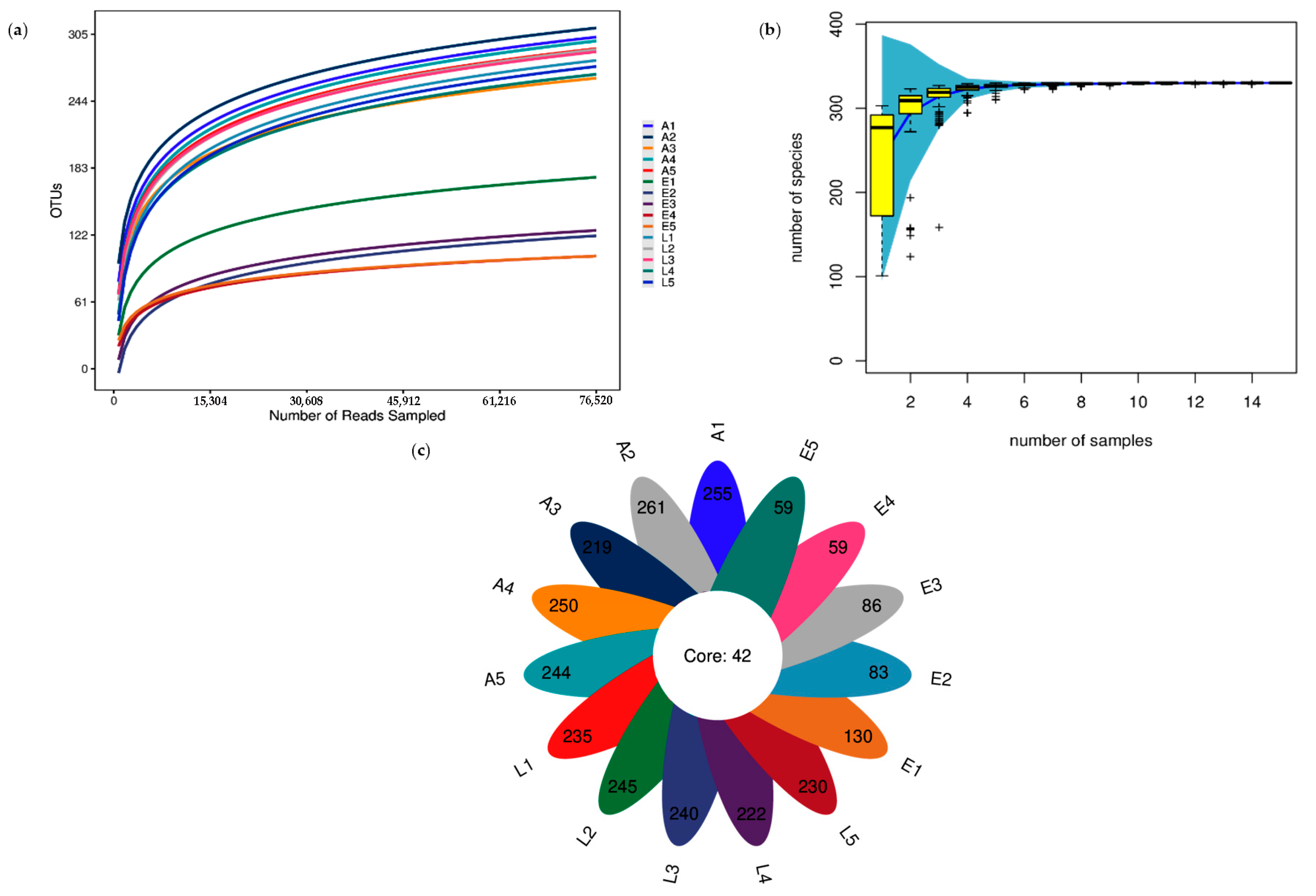 - Caporaso, J.G.; Kuczynski, J.; Stombaugh, J.; Bittinger, K.; Bushman, F.D.; Costello, E.K.; Fierer, N.; Peña, A.G.; Goodrich, J.K.; Gordon, J.I.; et al. QIIME allows analysis of high-throughput community sequencing data. Nat. Methods 2010, 7, 335–336. [Google Scholar] [CrossRef]