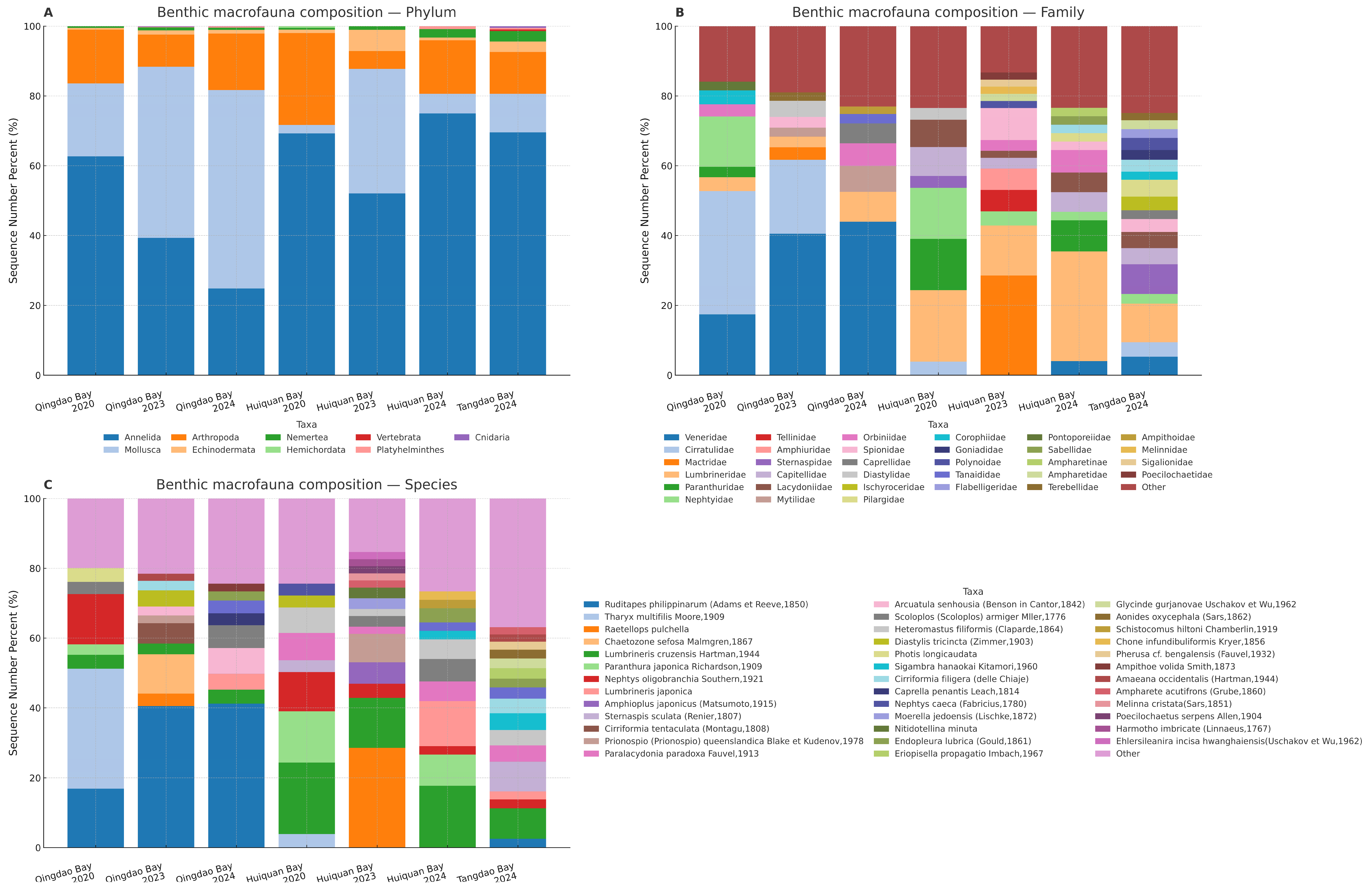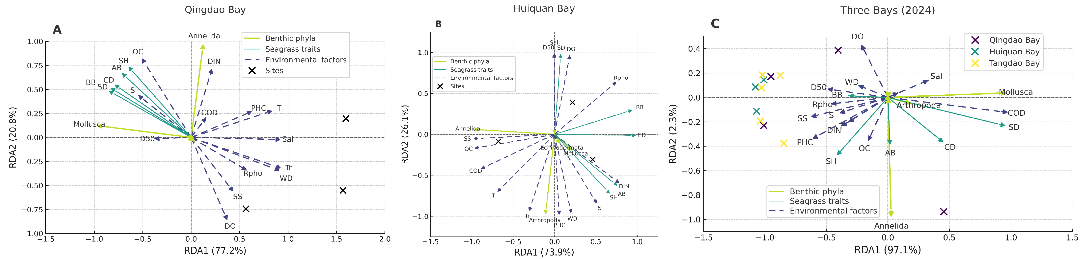 APA StyleSha, J., Song, X., Sun, P., Yang, Z., Bao, M., Wang, H., Wen, R., Yu, Q., & Wei, M. (2025). Ecological Characteristics of Temperate Seagrass Beds in Qingdao Coastal Waters and Ecological Response Relationships with Benthic Macrofauna Communities and Environmental Factors. Diversity, 17(12), 816. https://doi.org/10.3390/d17120816