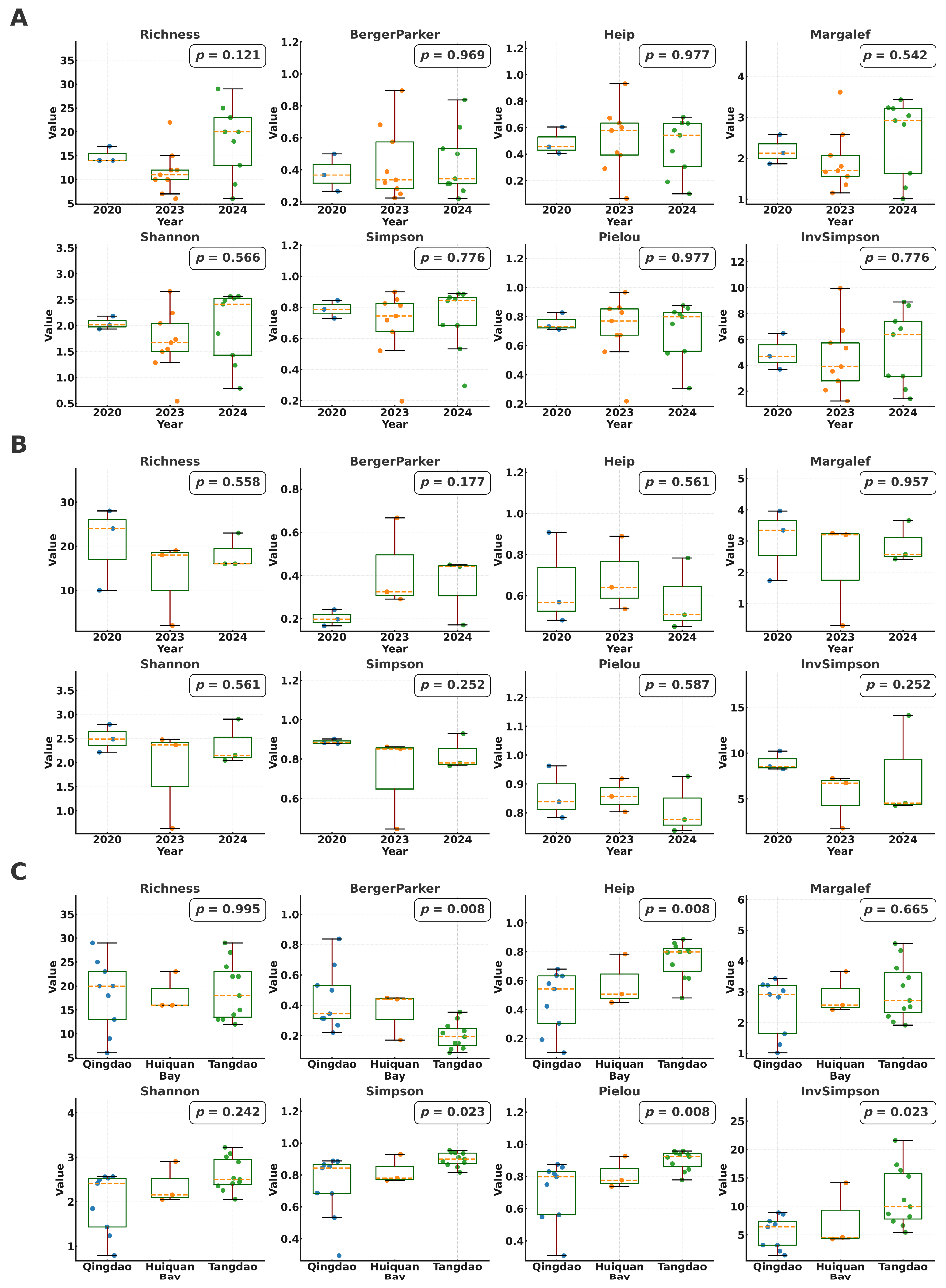 Sha J, Song X, Sun P, Yang Z, Bao M, Wang H, Wen R, Yu Q, Wei M. Ecological Characteristics of Temperate Seagrass Beds in Qingdao Coastal Waters and Ecological Response Relationships with Benthic Macrofauna Communities and Environmental Factors. Diversity. 2025; 17(12):816. https://doi.org/10.3390/d17120816