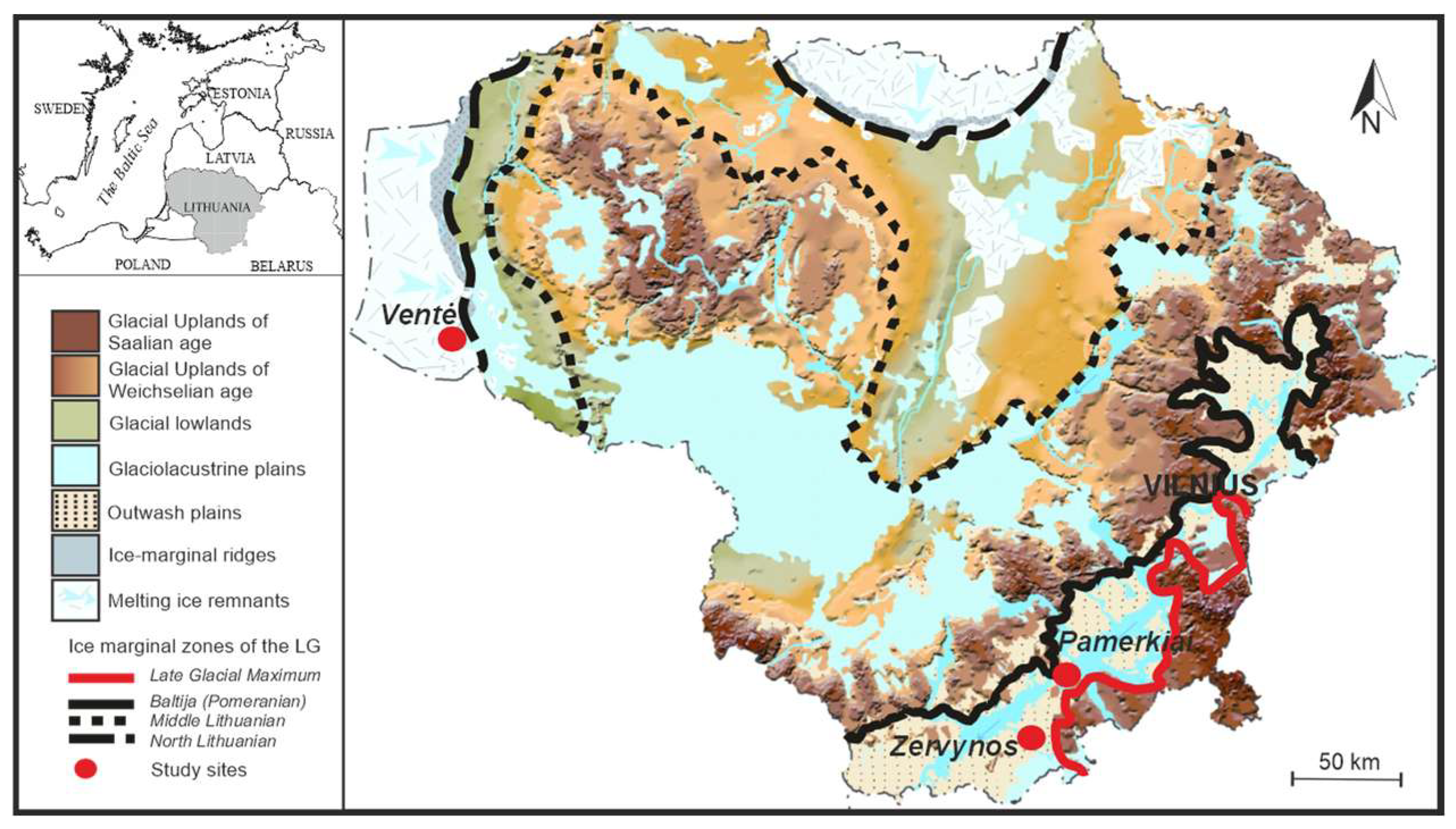 - Rinterknecht, V.R.; Bitinas, A.; Clark, P.U.; Raisbeck, G.M.; You, F.; Brook, E.J. Timing of the last glaciation in Lithuania. Boreas 2008, 37, 329–468. [Google Scholar] [CrossRef]