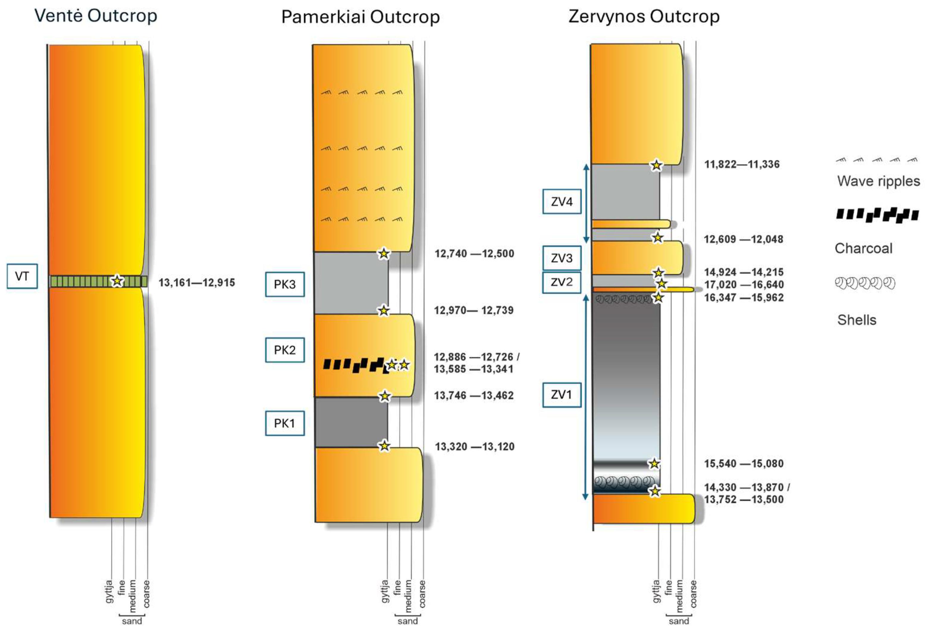 - Kalińska-Nartiša, E.; Thiel, C.; Nartišs, M.; Buylaert, J.-P.; Murray, A.S. Age and sedimentary record of inland eolian sediments in Lithuania, NE European Sand Belt. Quat. Res. 2015, 84, 82–95. [Google Scholar] [CrossRef]