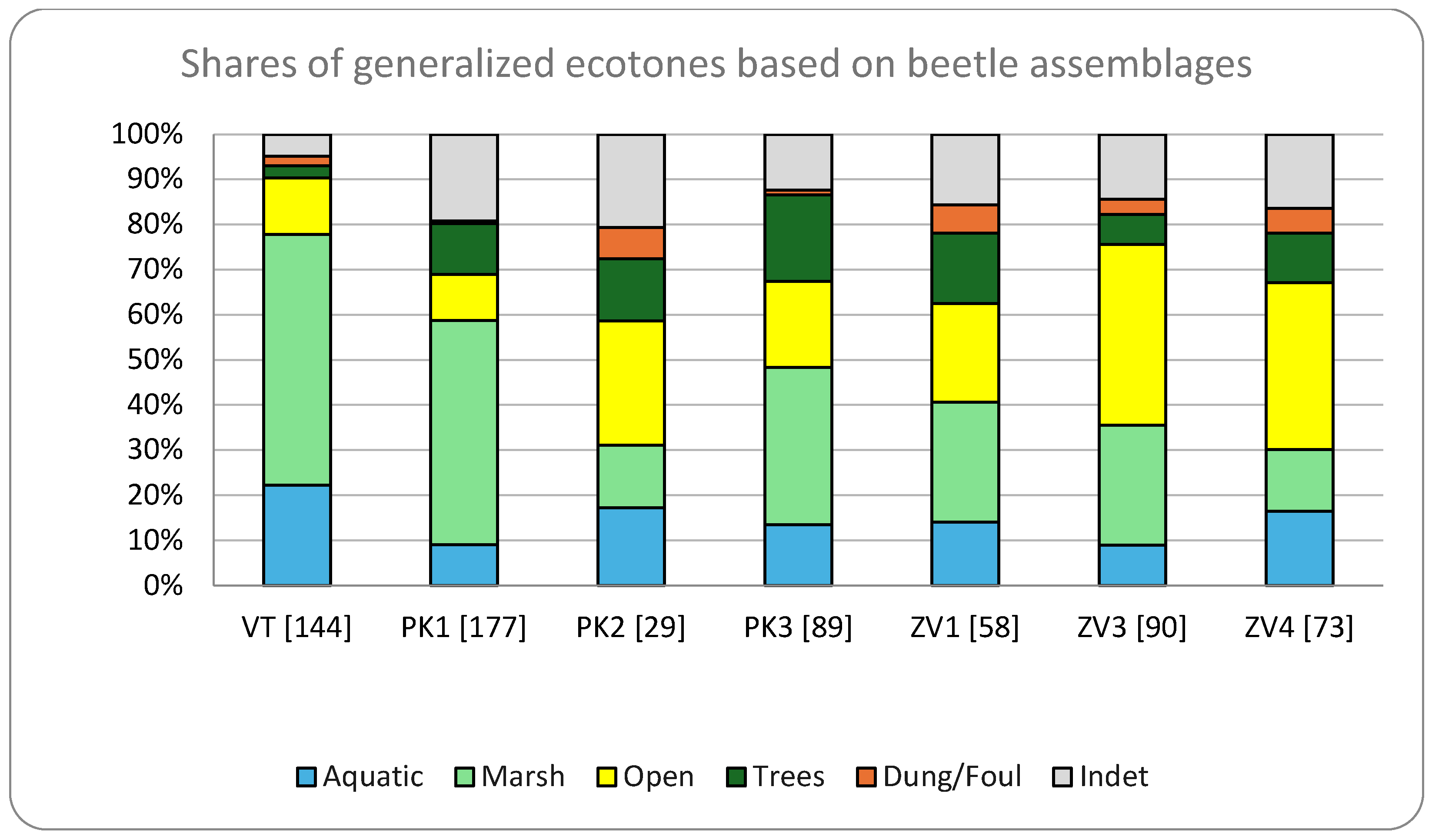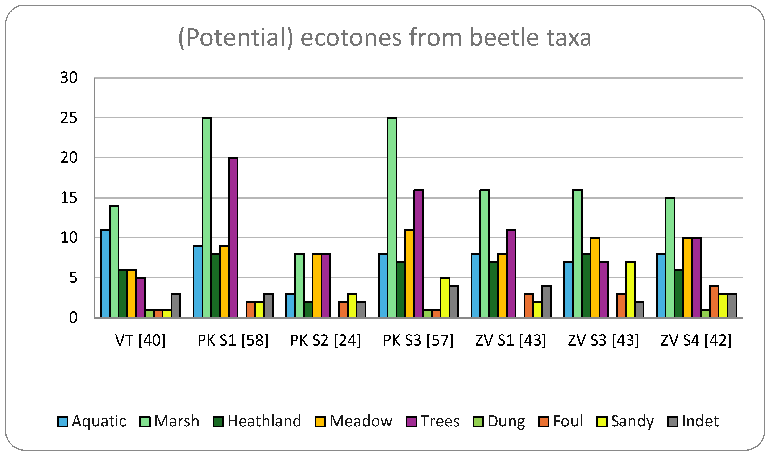- Robinson, M.A. The use of ecological groupings of Coleoptera for comparing sites. In The Environment of Man: The Iron Age to the Anglo-Saxon Period (British Archaeological Reports, British Series 87); Jones, M., Dimbleby, G., Eds.; British Archaeological Reports: Oxford, UK, 1981; pp. 251–286. [Google Scholar]